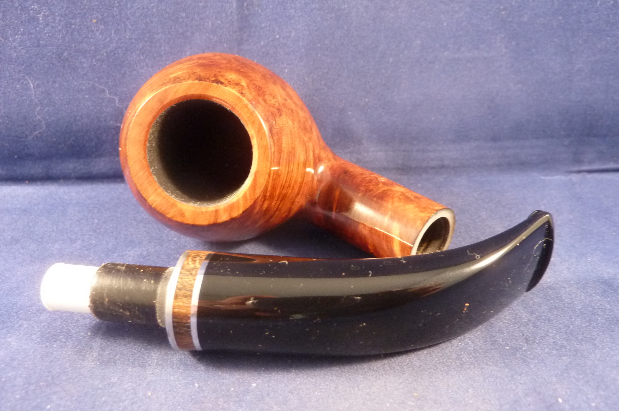 This is a brand new pipe made by L'Anatra in Italy. This Italian pipe has an elegant shape and a light brown finish and a sterling silver ring.
