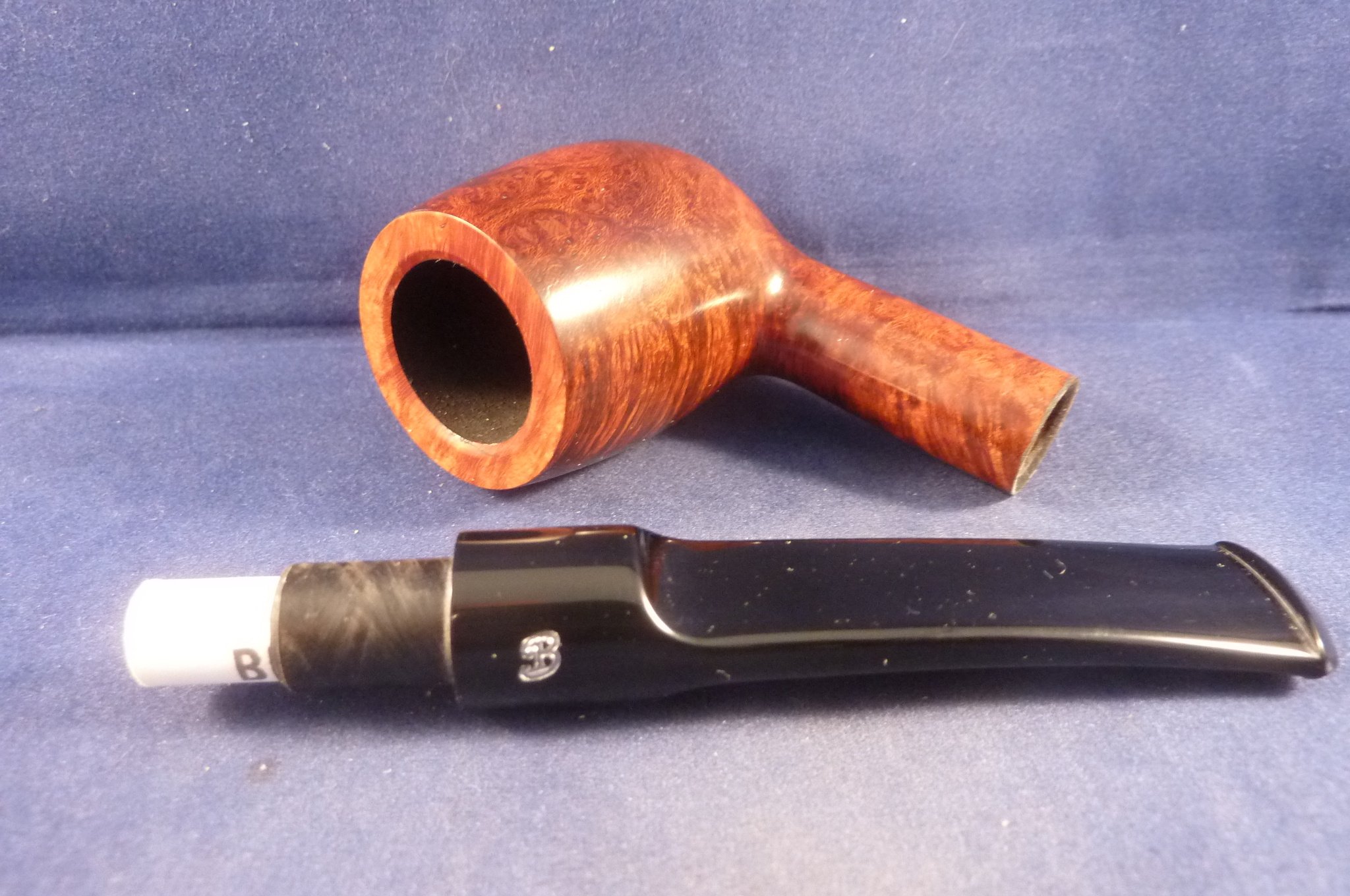 This is a briar pipe in a smooth brown finish made in Italy for Giordano. Acrylic mouthpiece, 9 mm. filter.