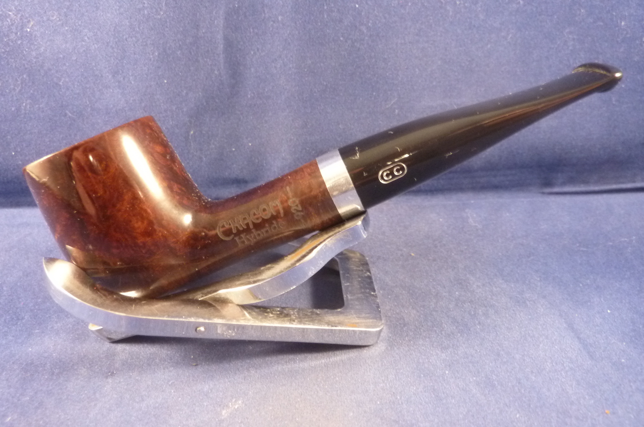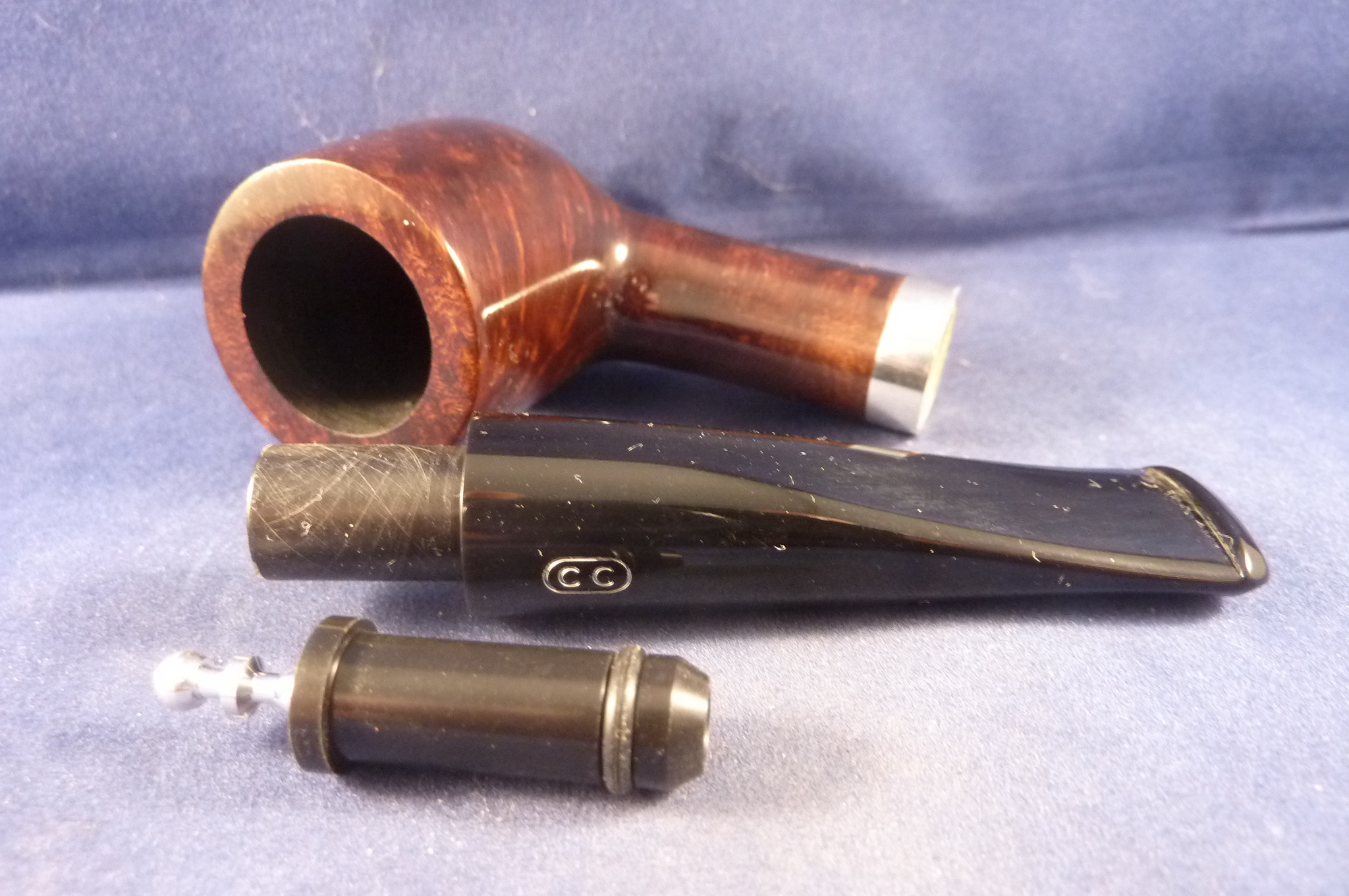 Small briar pipe with a metal ring made in France by Chacom. Acrylic black mouthpiece. Made with 9 mm. filters or without with the free adaptor.