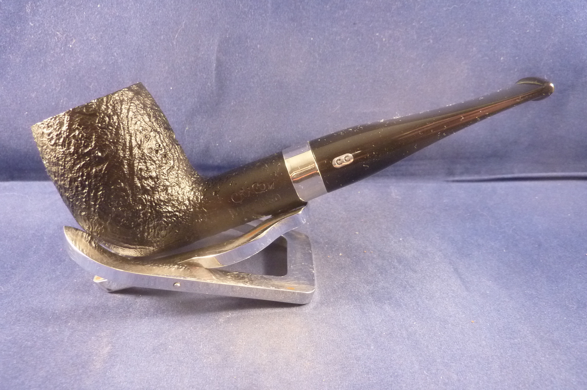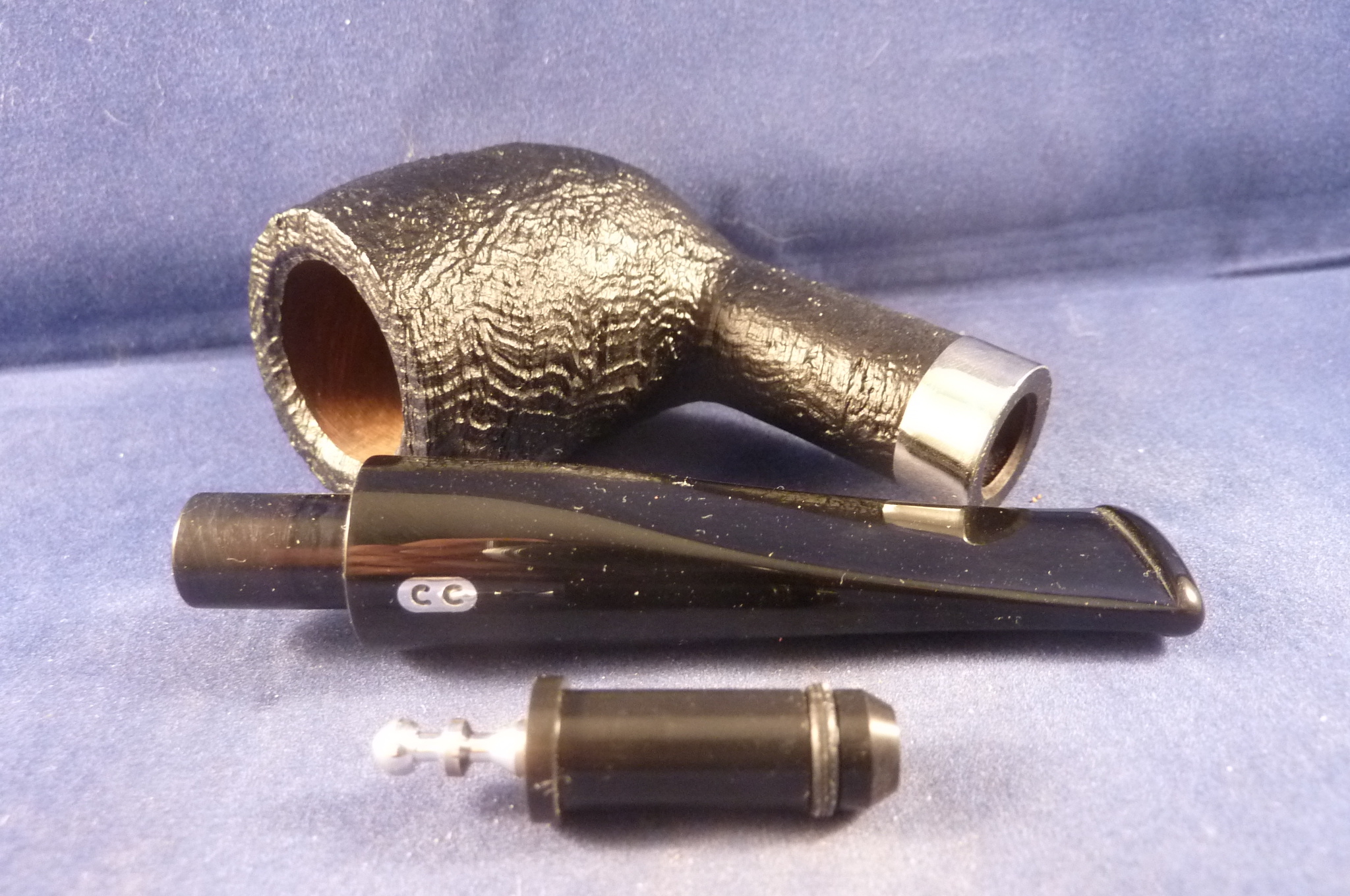 Sandblasted briar pipe with a metal ring made in France by Chacom. Acrylic black mouthpiece. Made with 9 mm. filters or without with the free adaptor.