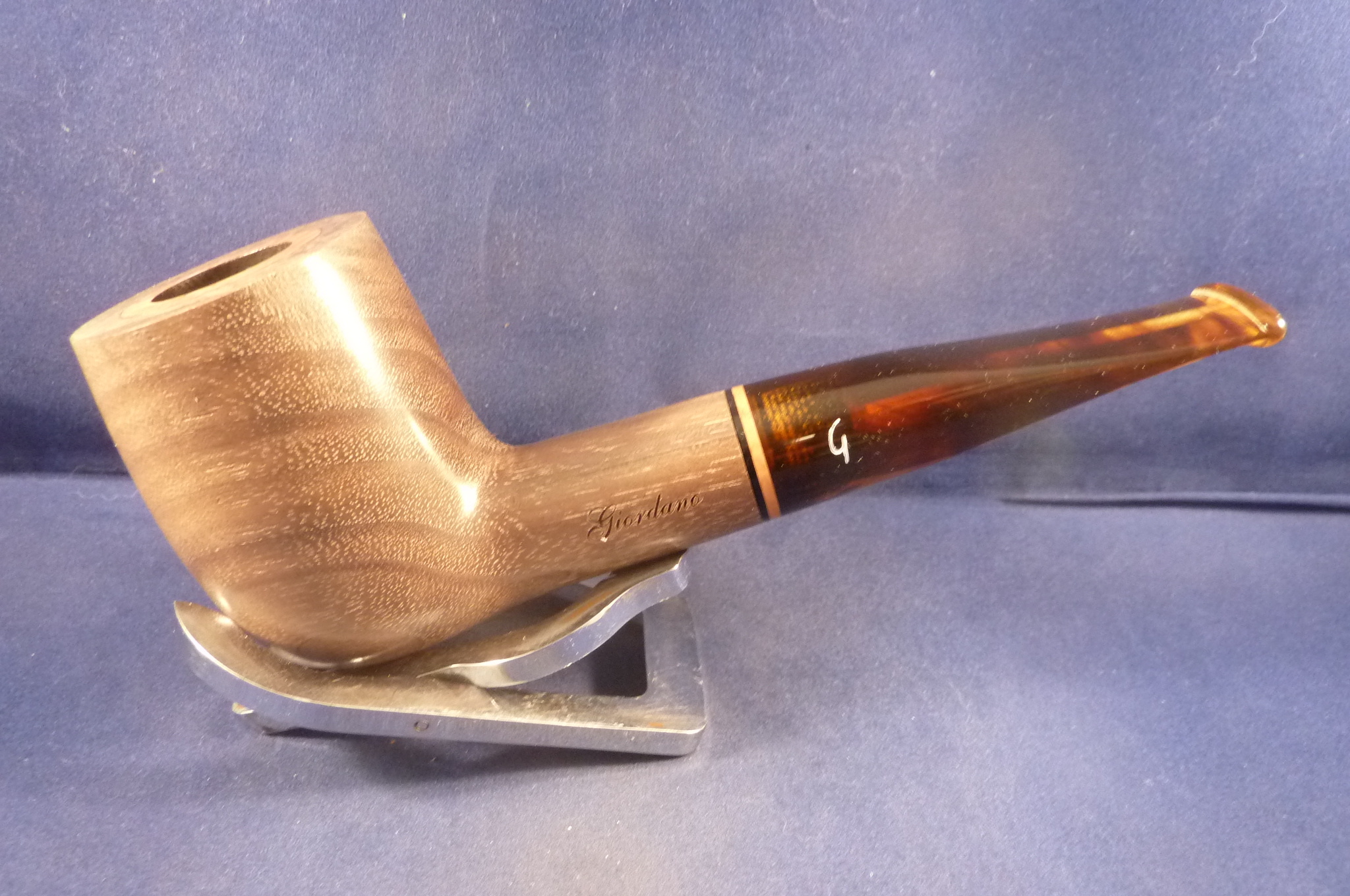 This is a briar pipe in a carved rusicated finish made in Italy for Giordano. Acrylic mouthpiece with a metal ring, 9 mm. filter.