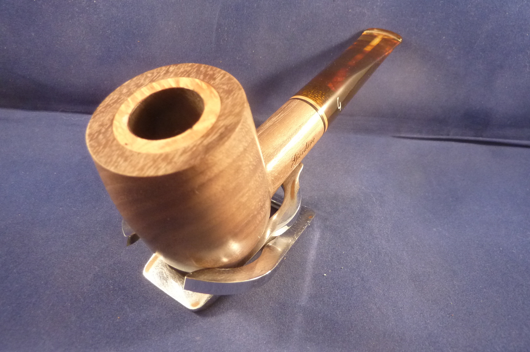 Smooth walnut pipe with a briar inlay made by Giordano in Italy. Acrylic mouthpiece, 9 mm. filter.