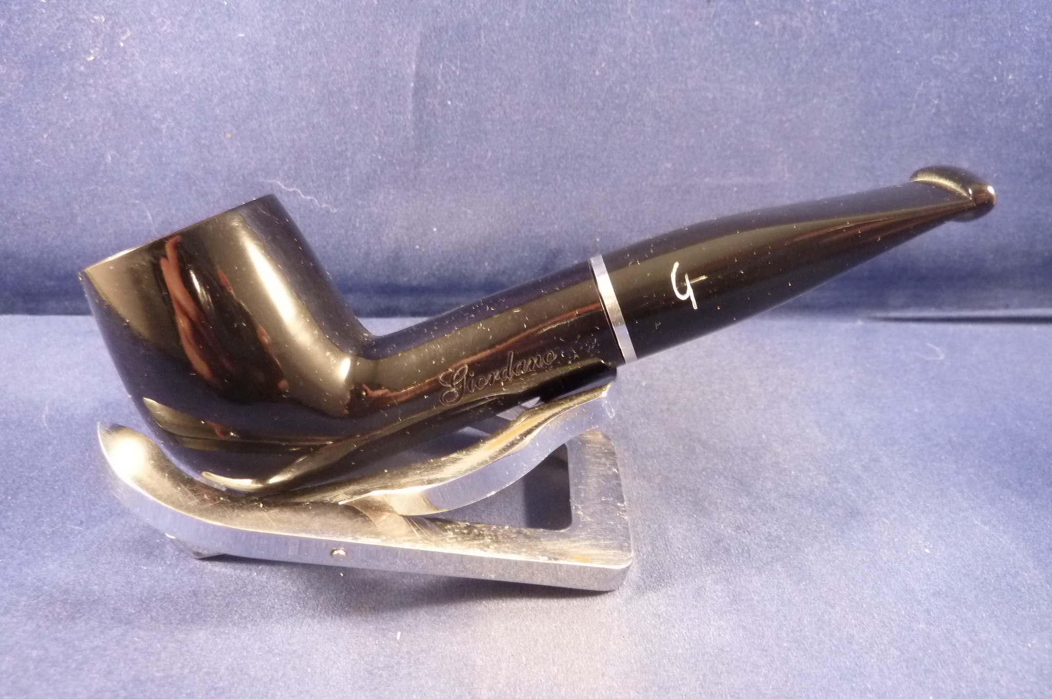 This is a briar pipe in a smooth brown finish made in Italy for Giordano. Acrylic mouthpiece with a black & white acrylic ring, 9 mm. filter.