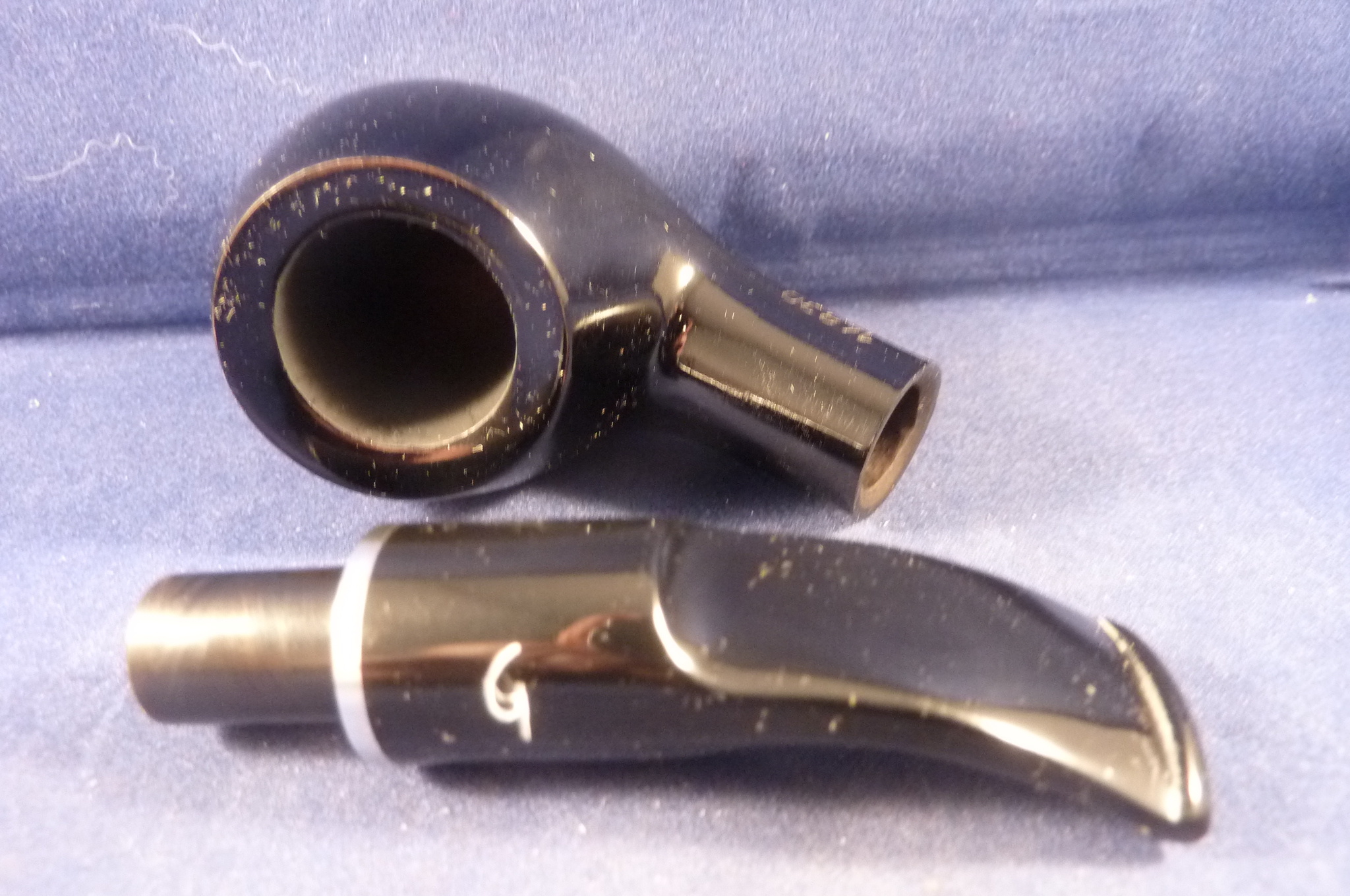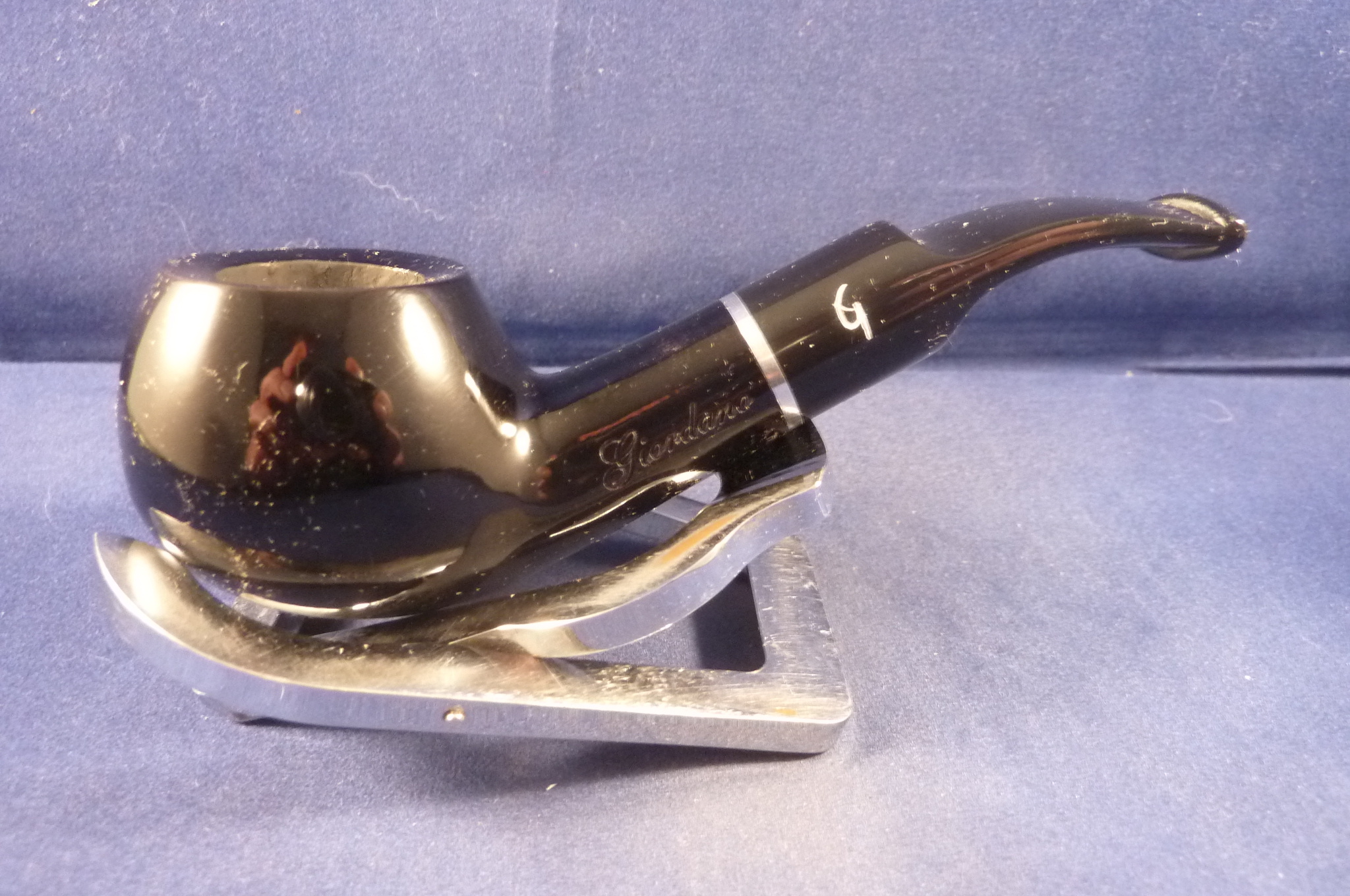 This is a briar pipe in a smooth brown finish made in Italy for Giordano. Acrylic mouthpiece with a black & white acrylic ring, 9 mm. filter.