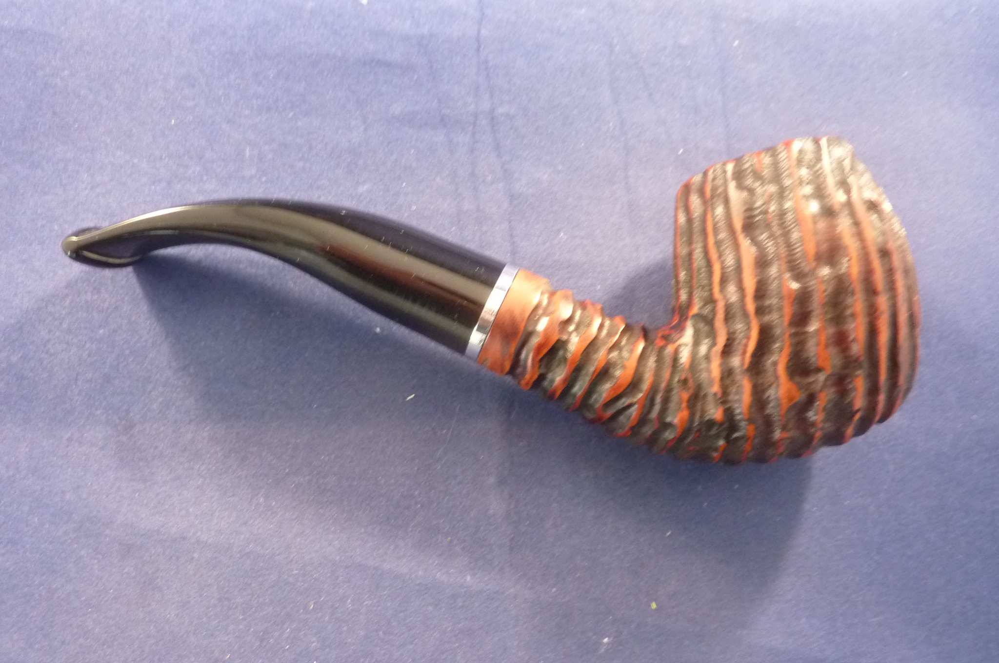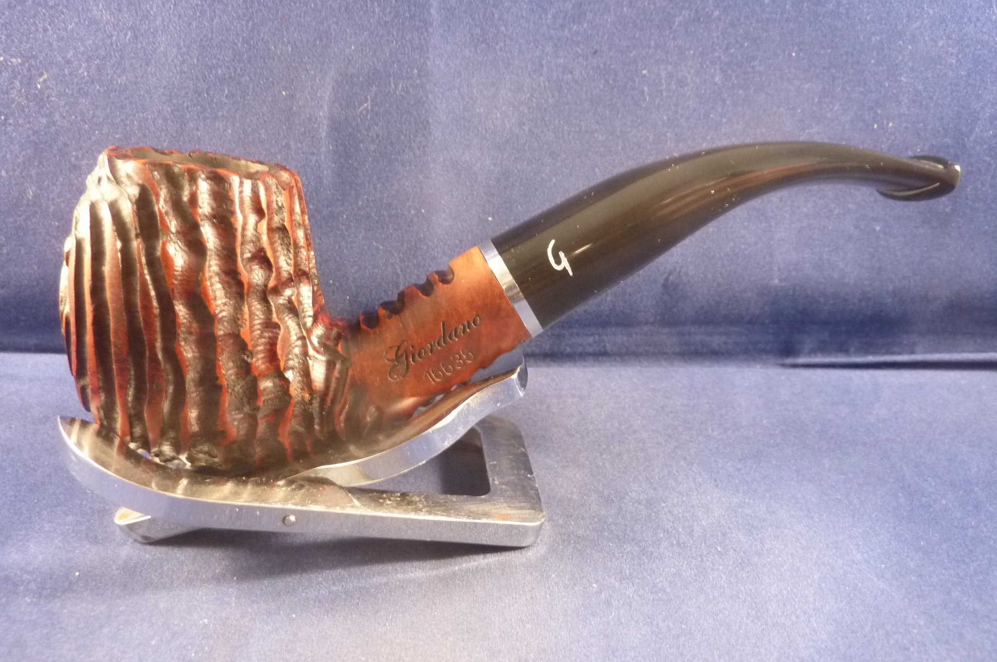 This is a briar pipe in a carved rusicated finish made in Italy for Giordano. Acrylic mouthpiece with a metal ring, 9 mm. filter.