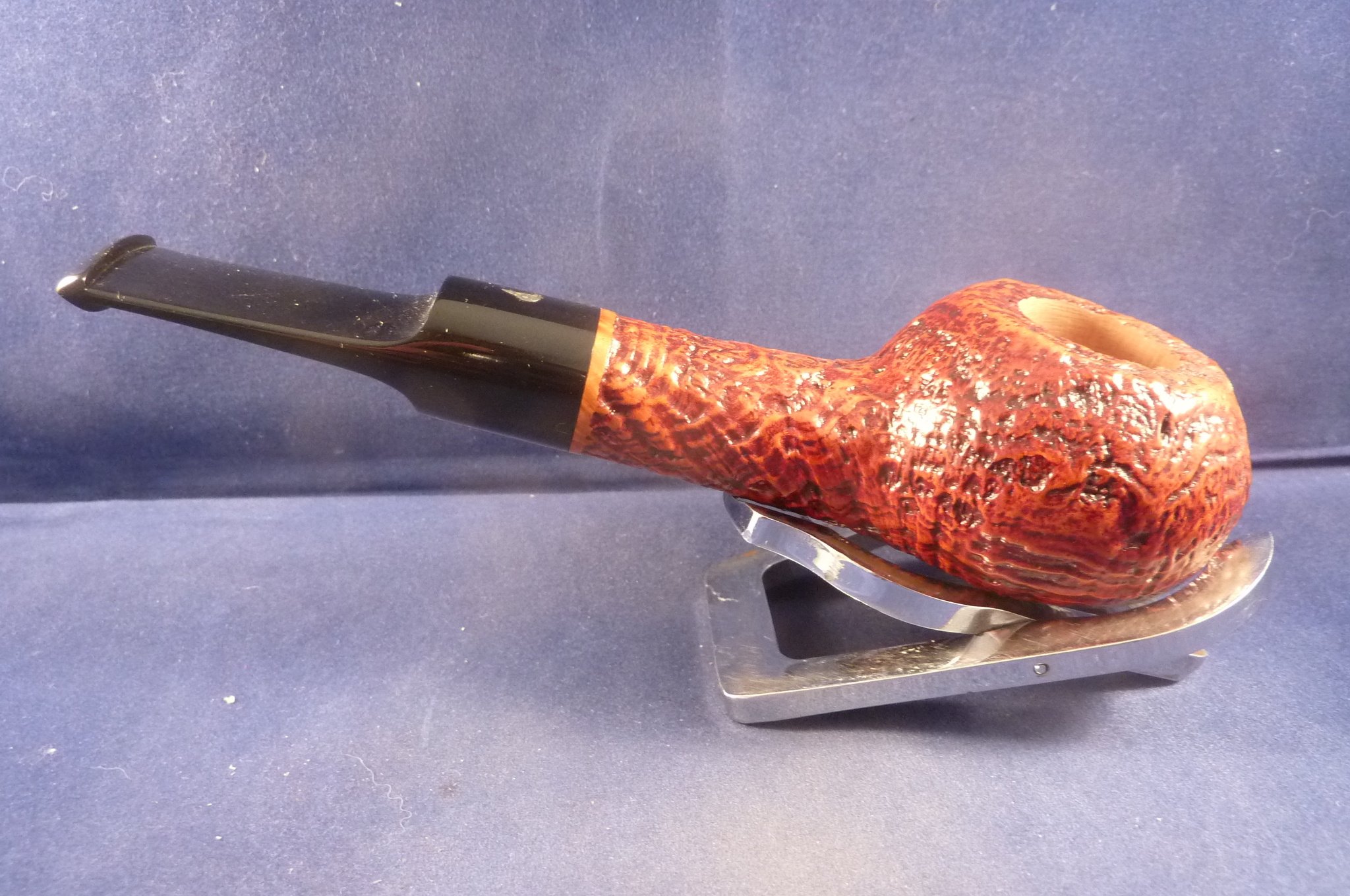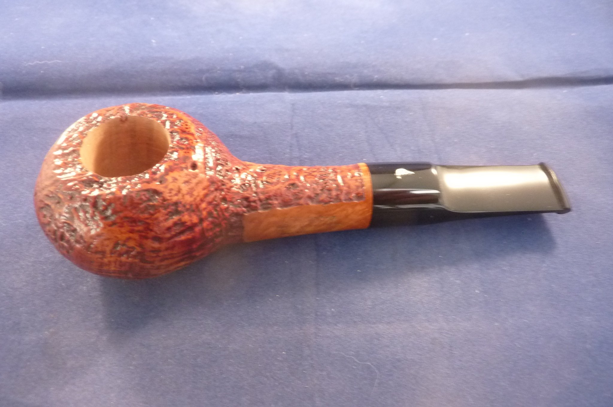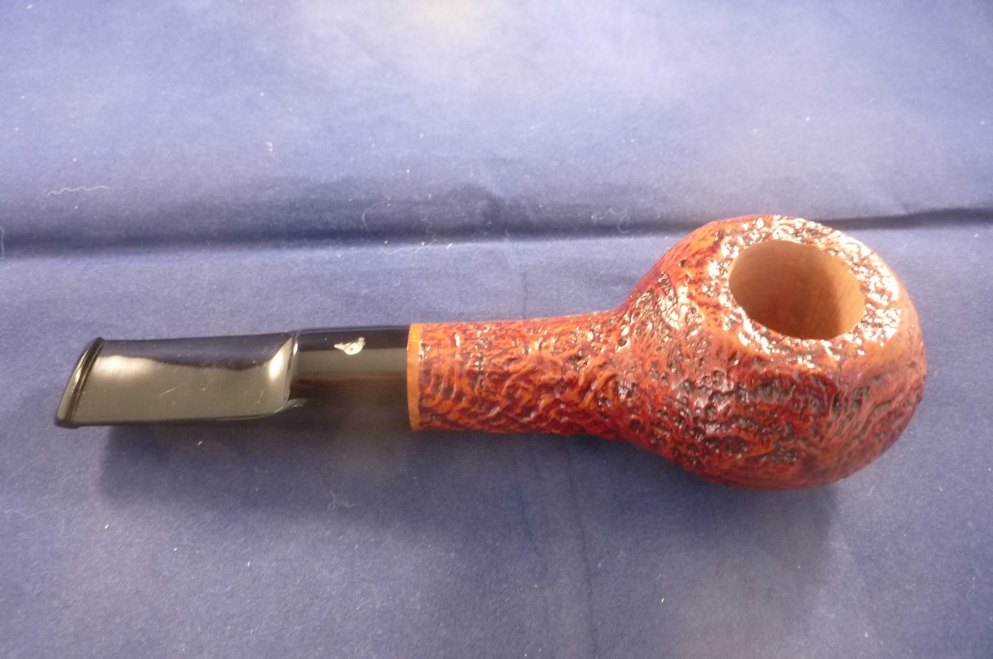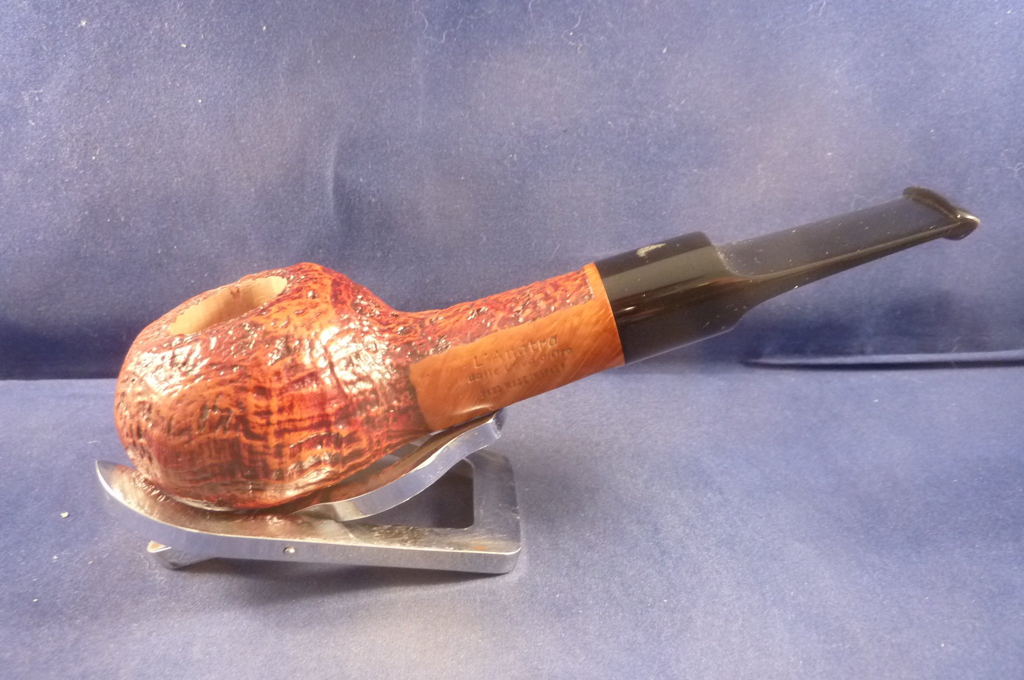 This is a brand new pipe made by L'Anatra in Italy. This Italian pipe has really great colours and has been beautiful sandblasted. Acrylic mouthpiece, with 9 mm. filter.