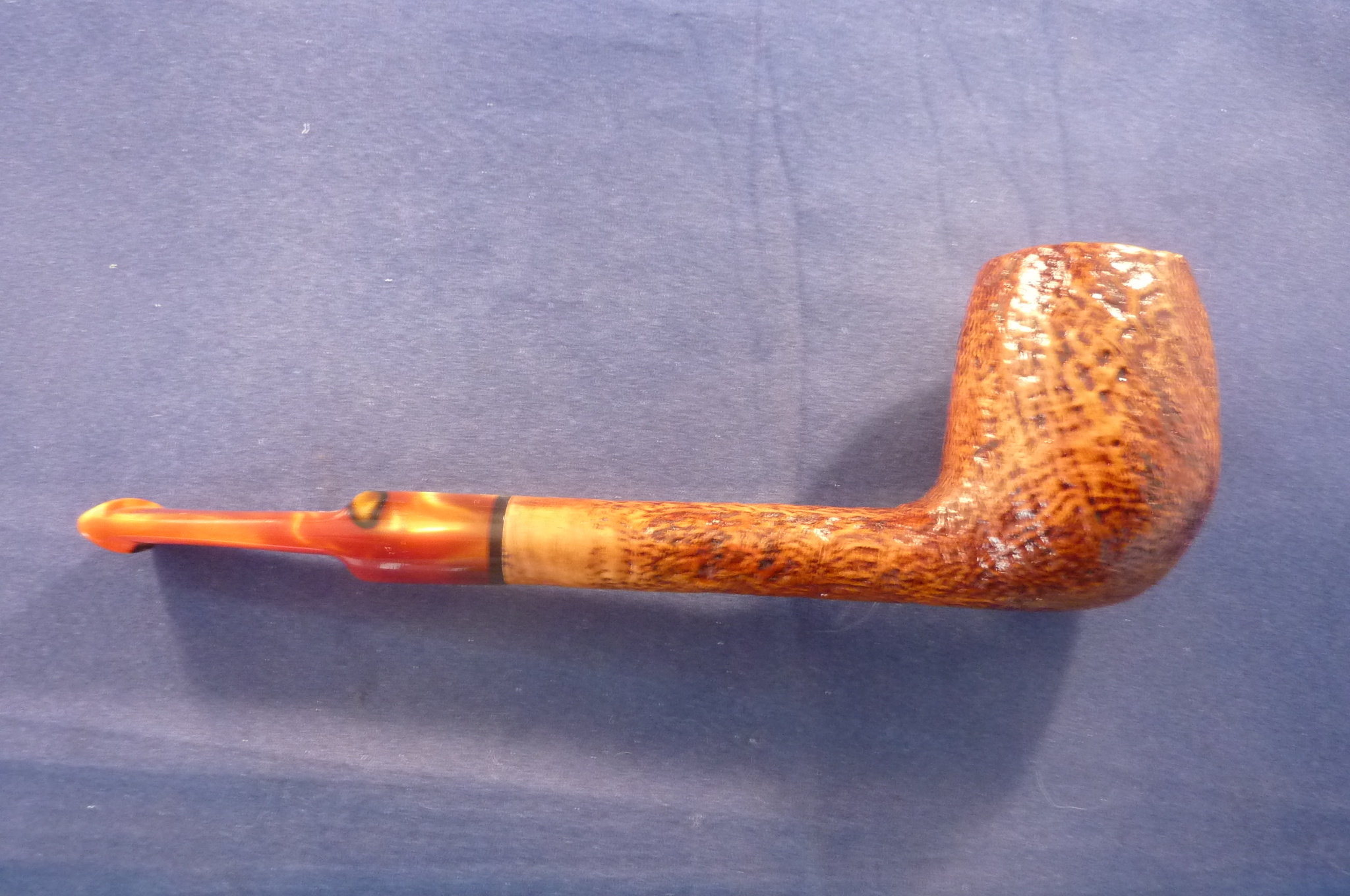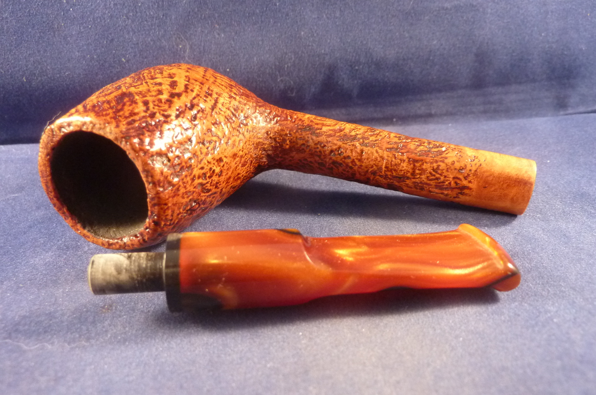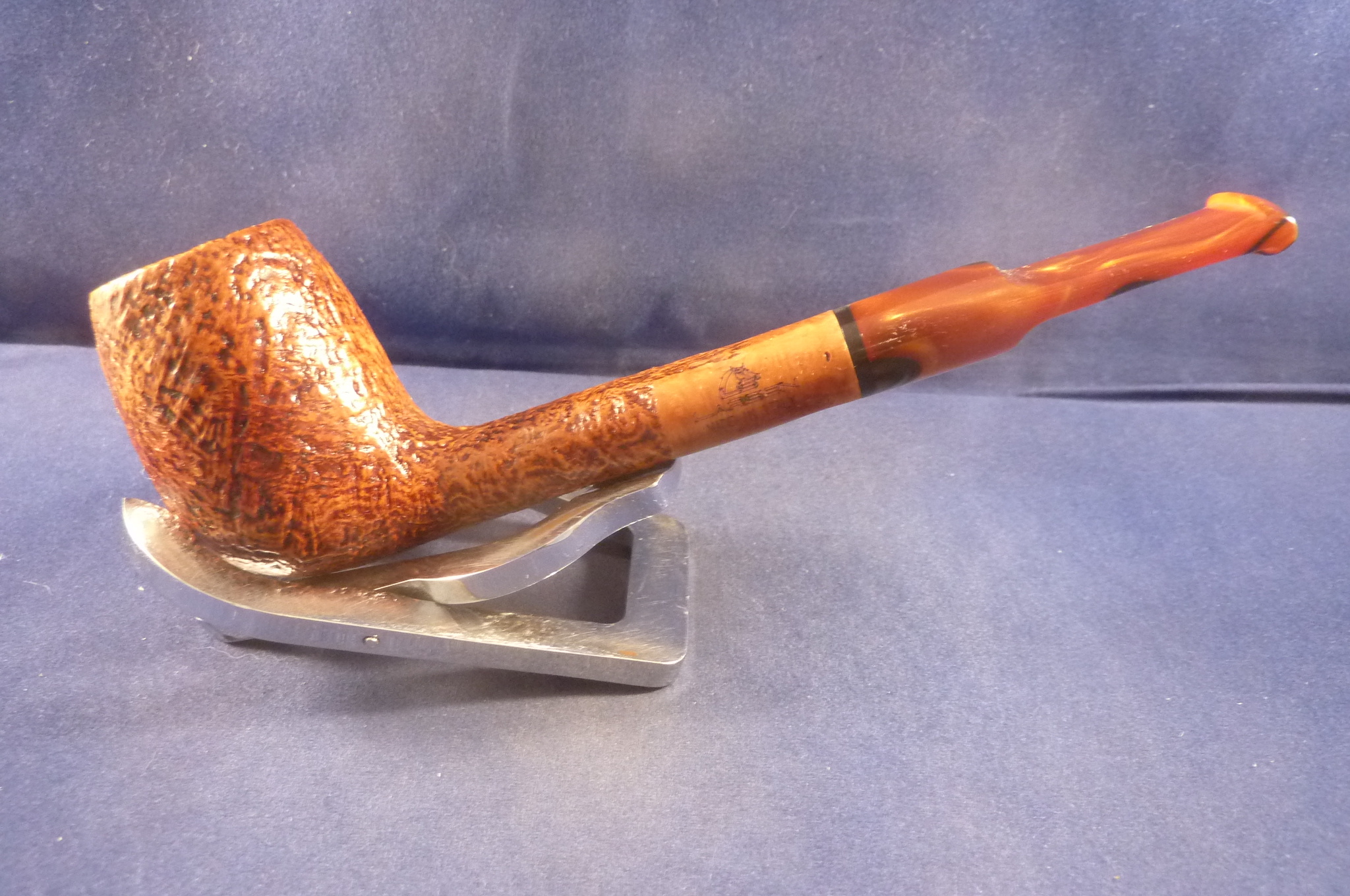 This is a brand new pipe made in Italy. This sandblasted briar pipe has an acrylic mouthpiece, without filter.