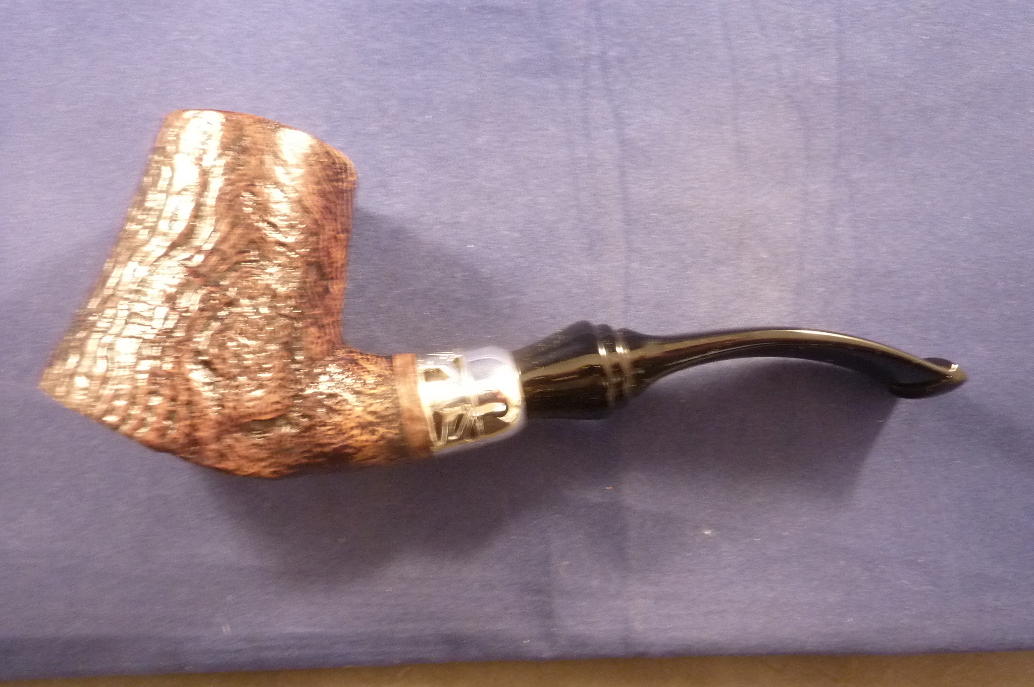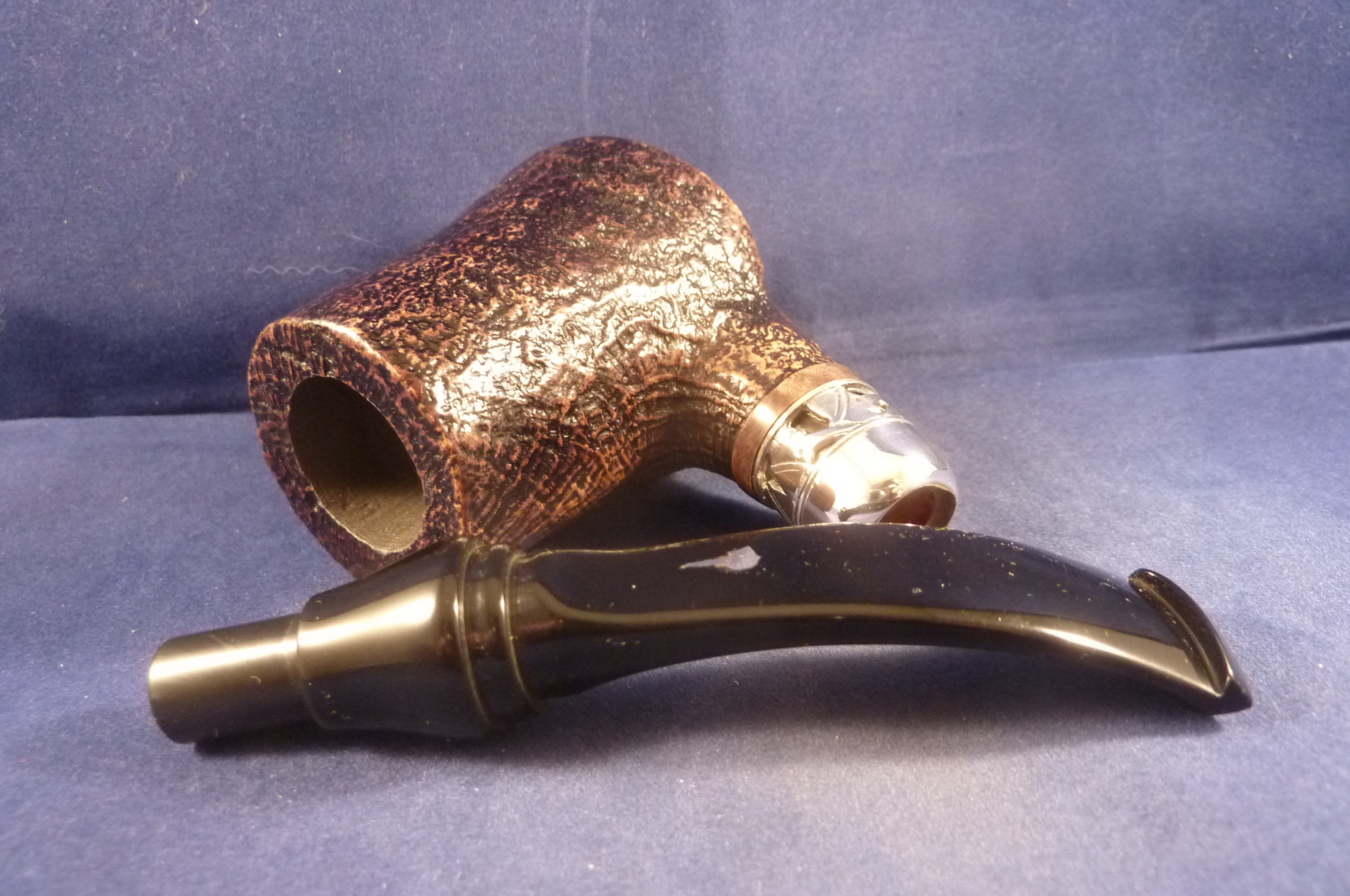 This is a brand new pipe made by Mastro Geppetto in Italy. This sandblasted briar pipe has a beautiful shape and a sterling silver mount. Acrylic mouthpiece with a Pinokkio design, with 9 mm. filter. Mastro Geppetto has been made by Ser Jacopo.