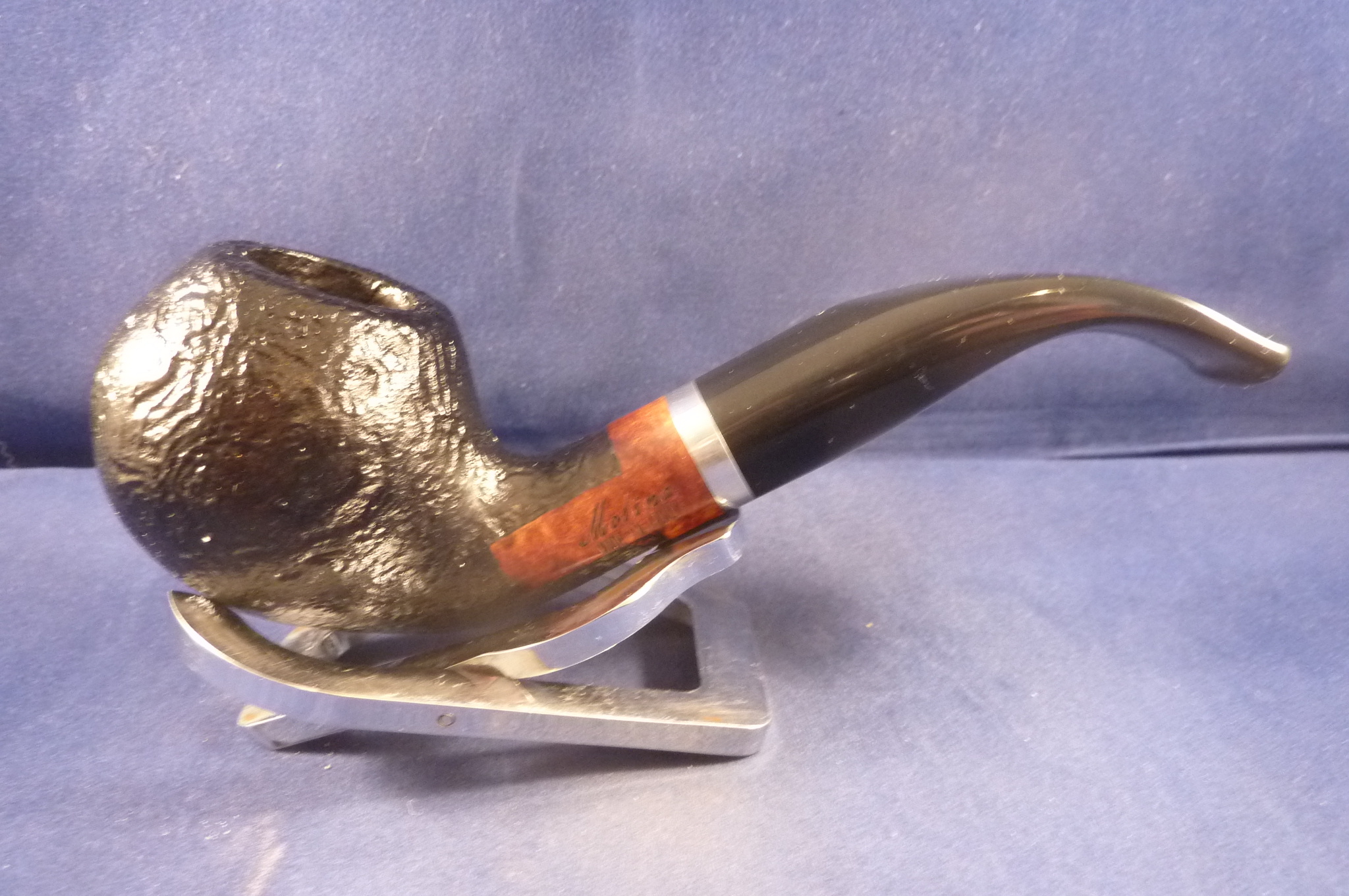Sandblasted briar pipe with a chrome ring made by Molina in Italy. Acrylic black mouthpiece, 9 mm. filter.