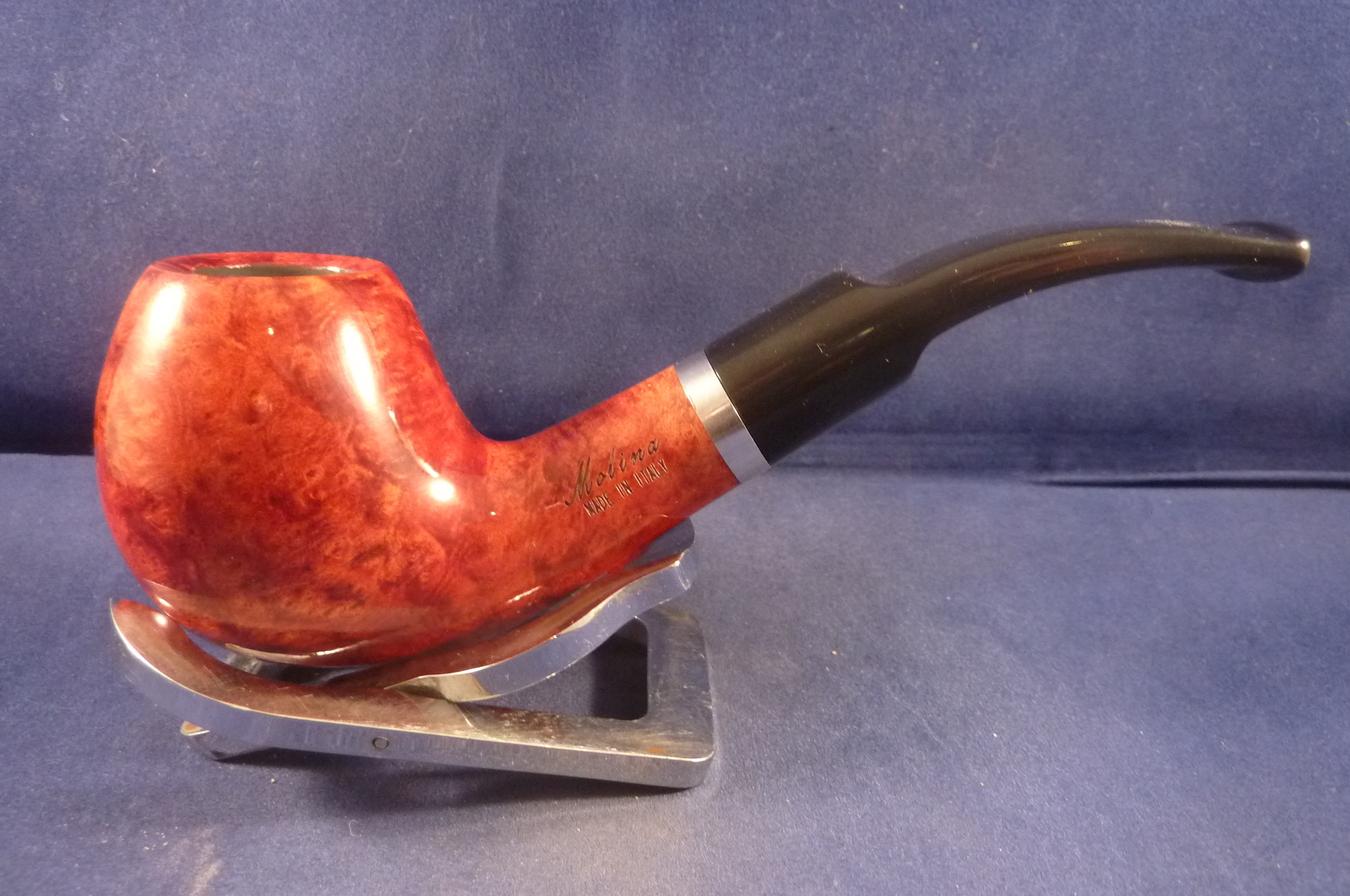 Smooth briar pipe with a chrome ring made by Molina in Italy. Acrylic black mouthpiece, 9 mm. filter.