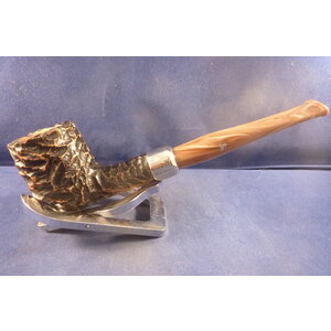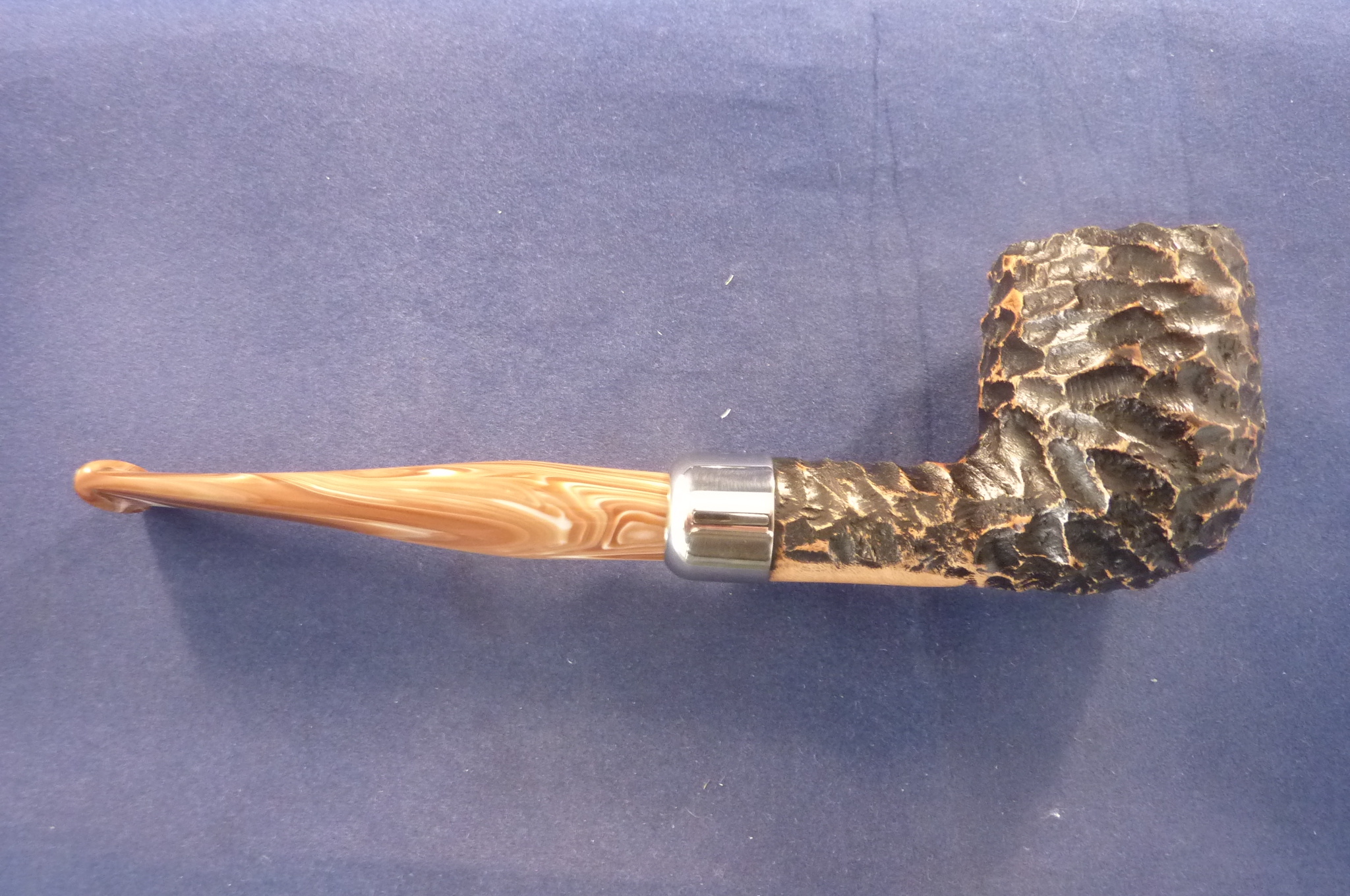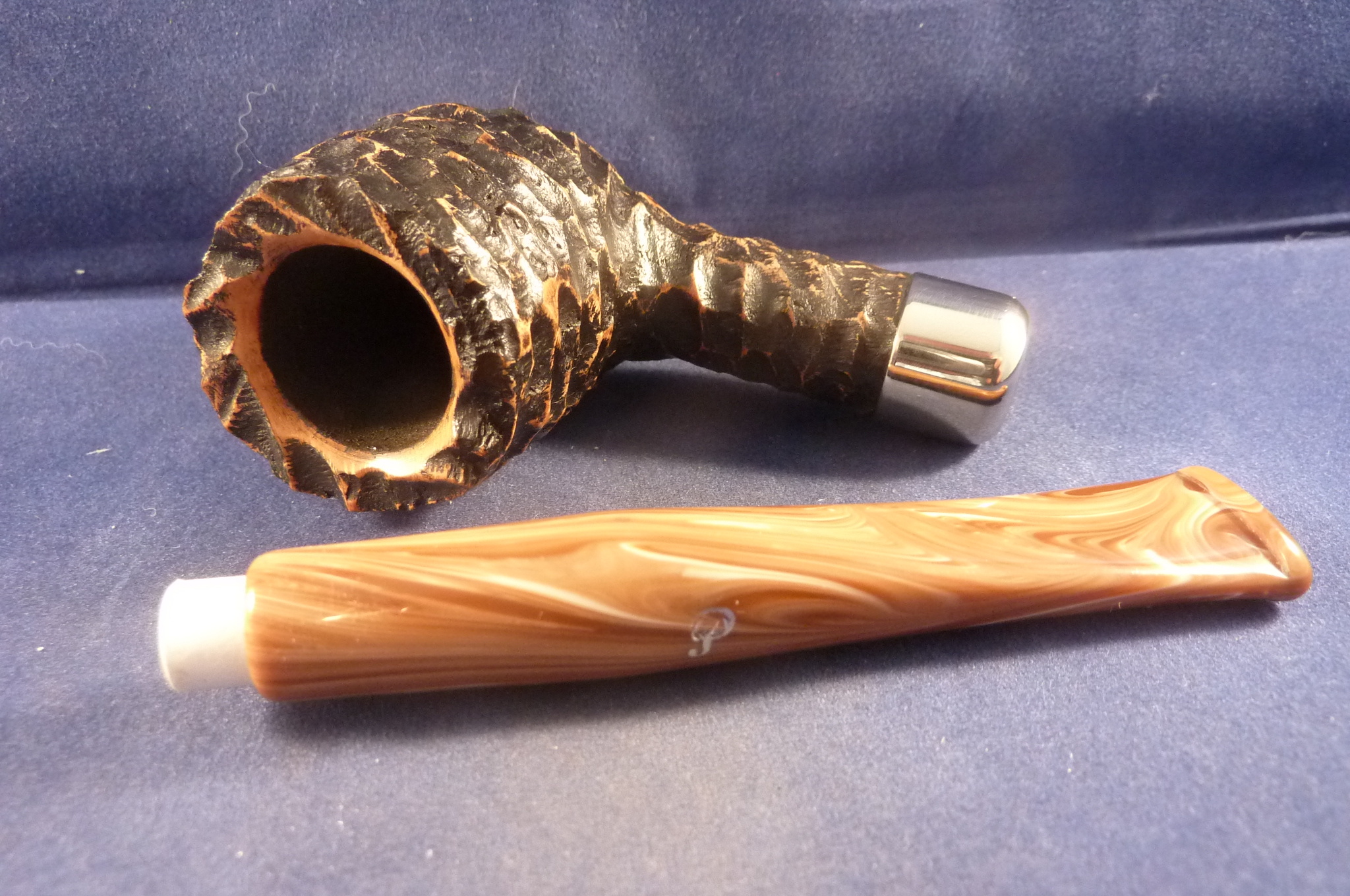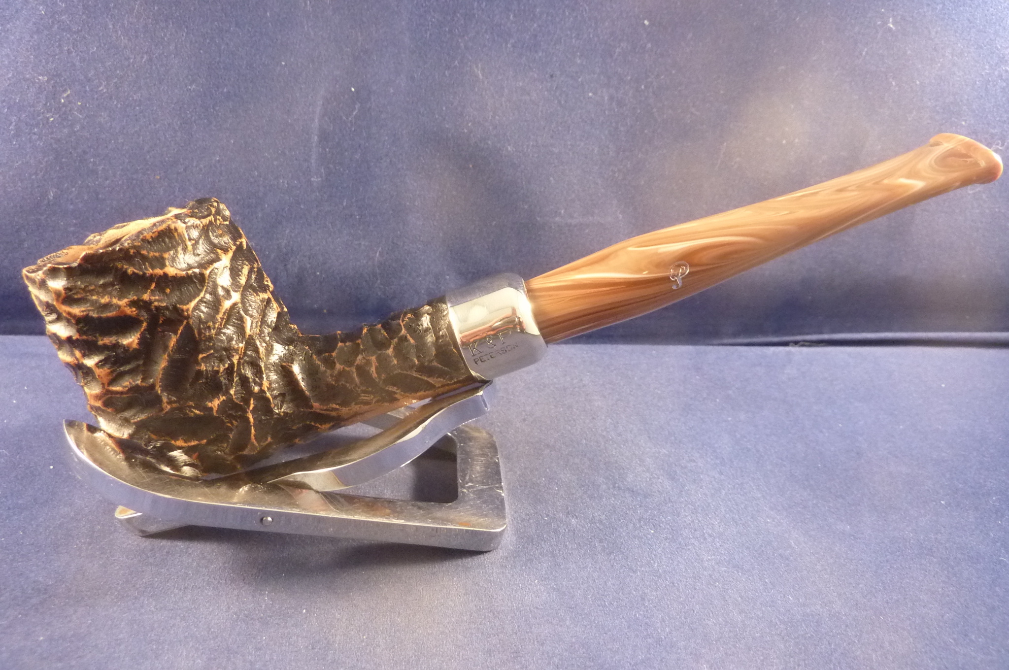 Beautiful briar pipe in a rusticated finish with a nickel mount, made by Peterson in Ireland. The pipe has a black fishtail mouthpiece, without filter.