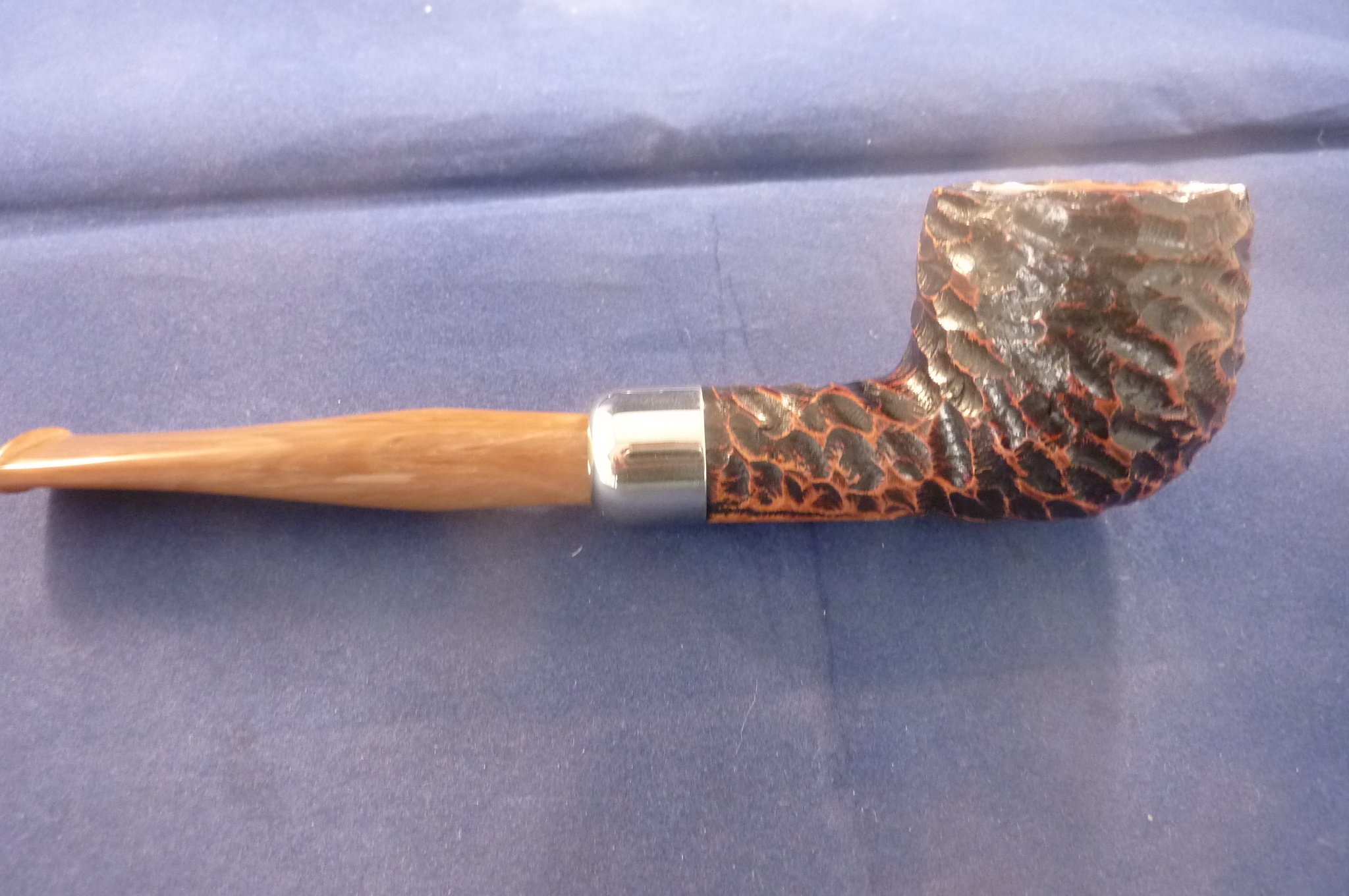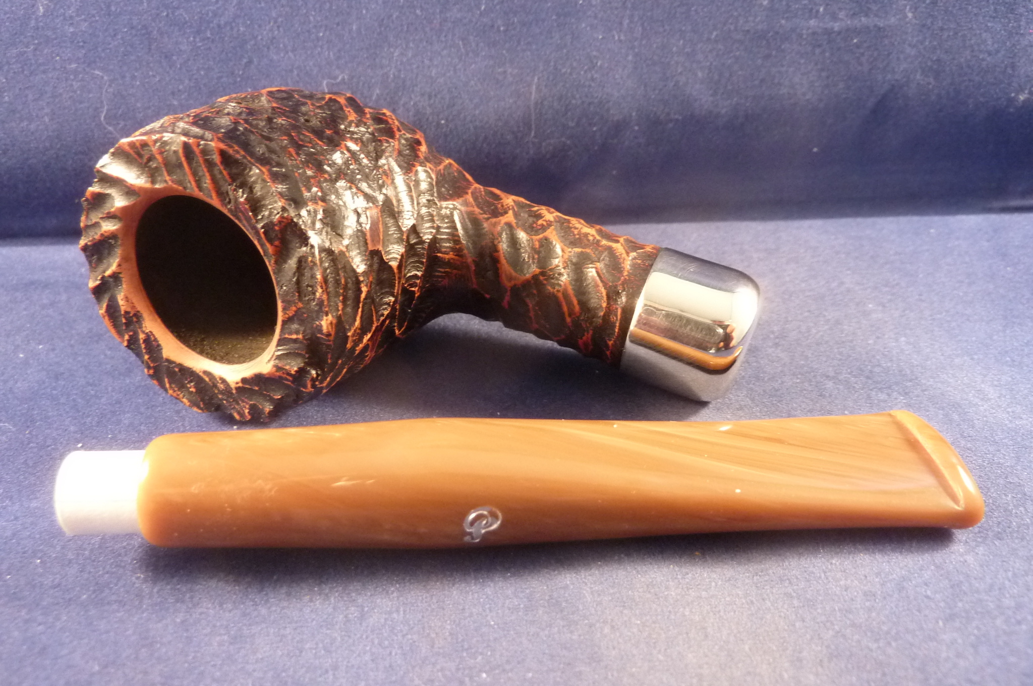 Beautiful briar pipe in a rusticated finish with a nickel mount, made by Peterson in Ireland. The pipe has a black fishtail mouthpiece, without filter.