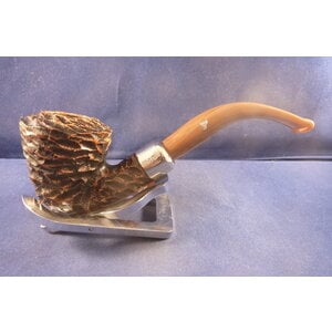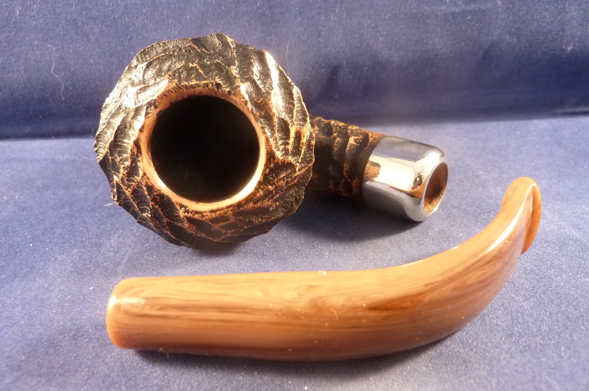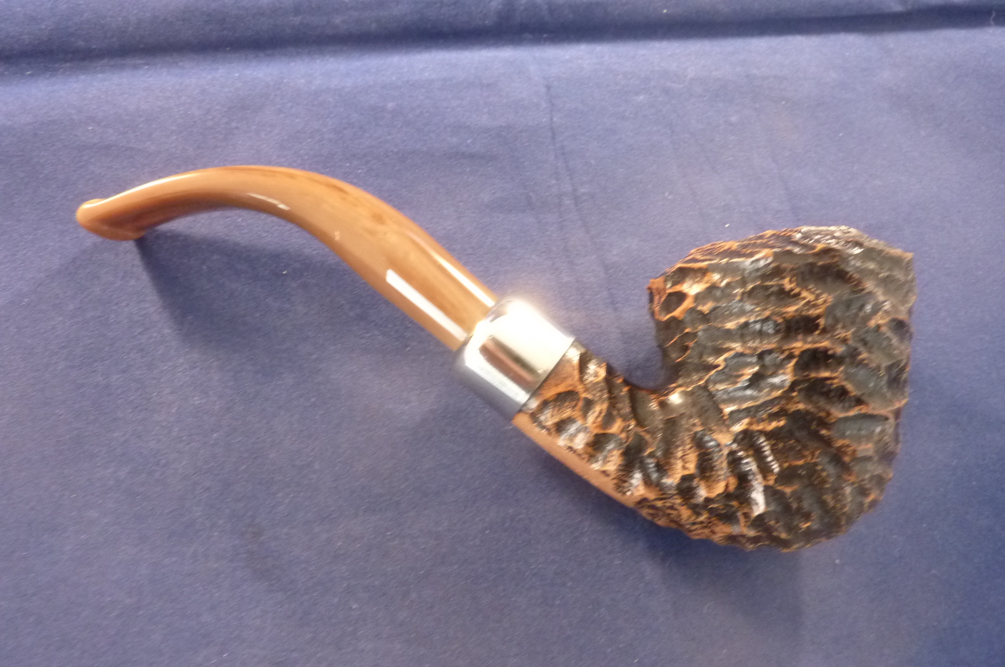 Beautiful briar pipe in a rusticated finish with a nickel mount, made by Peterson in Ireland. The pipe has a black fishtail mouthpiece, without filter.