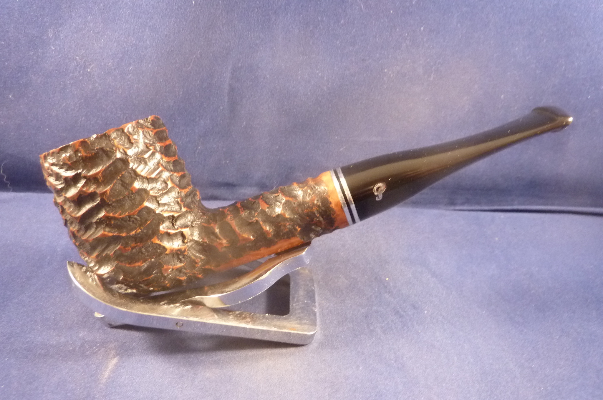 This is a brand new pipe made by Luigi Viprati in Italy. Beautiful hand made rusticated briar pipe. Grey marbled acrylic mouthpiece, 9 mm. filter.