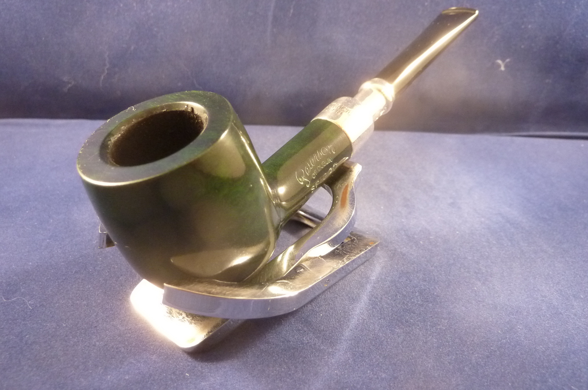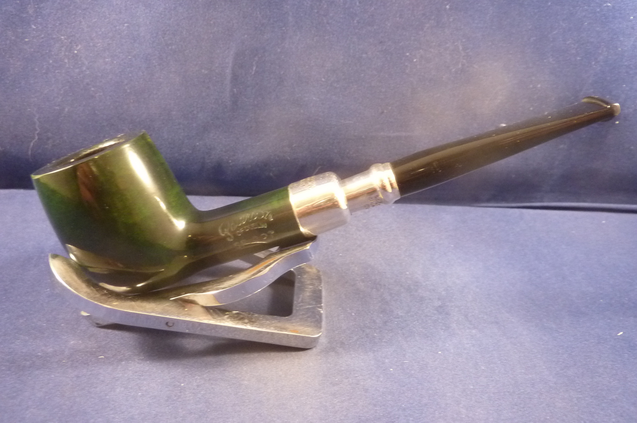 The Peterson tradition has long been associated with the fine sterling silver detail of our pipes. The Peterson Spigot is characterised by a sterling silver covering on the tapered end of the mouthpiece which compliments the sterling silver band of the pipe. The Spigot style evolved from the practice of soldiers in earlier centuries who repaired broken pipes by sliding a used cartridge case over the shank and reinserting the mouthpiece. In this unique spigot finished pipe, Peterson craftsmanship perfect the union of finest quality briar and precious metals. The silver is spun to shape and then fitted to the pipe. The craftsmanship, created with only a lathe and chisel as basic tools, is the finest in the industry. Normally fitted with fishtail mouthpiece.