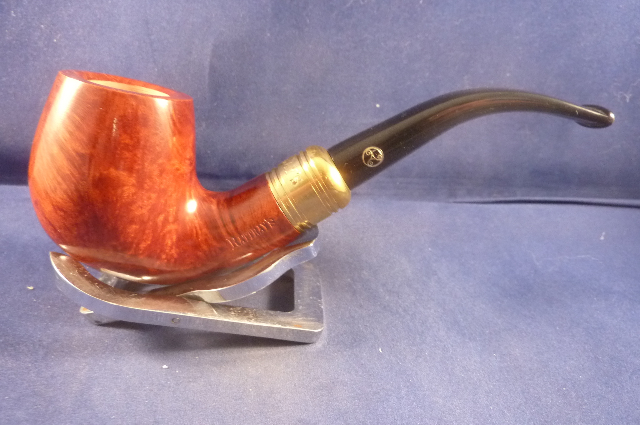 Smooth briar pipe with a brass application made for Rattray's. Black acrylic mouthpiece, 9 mm. filter.