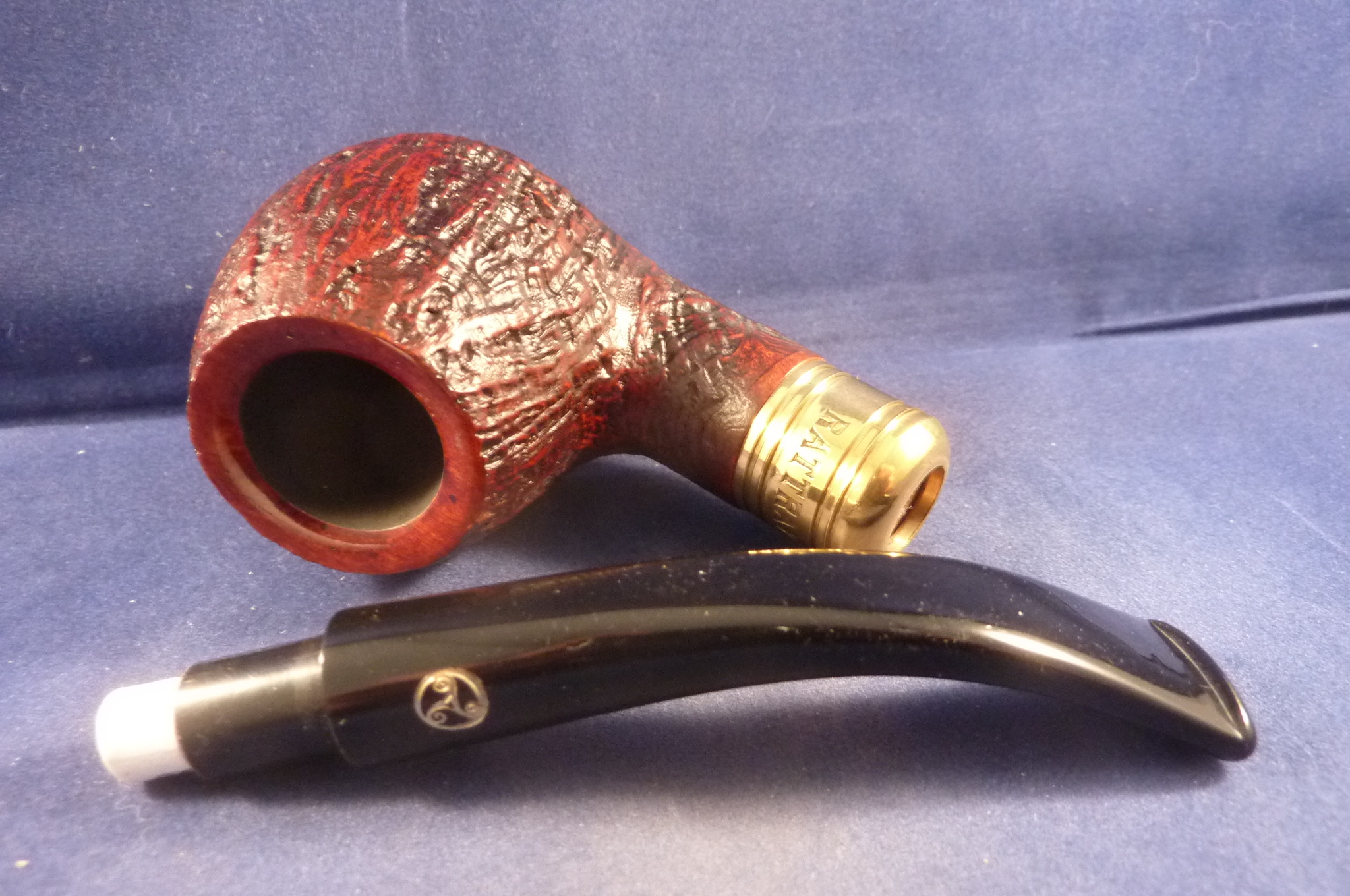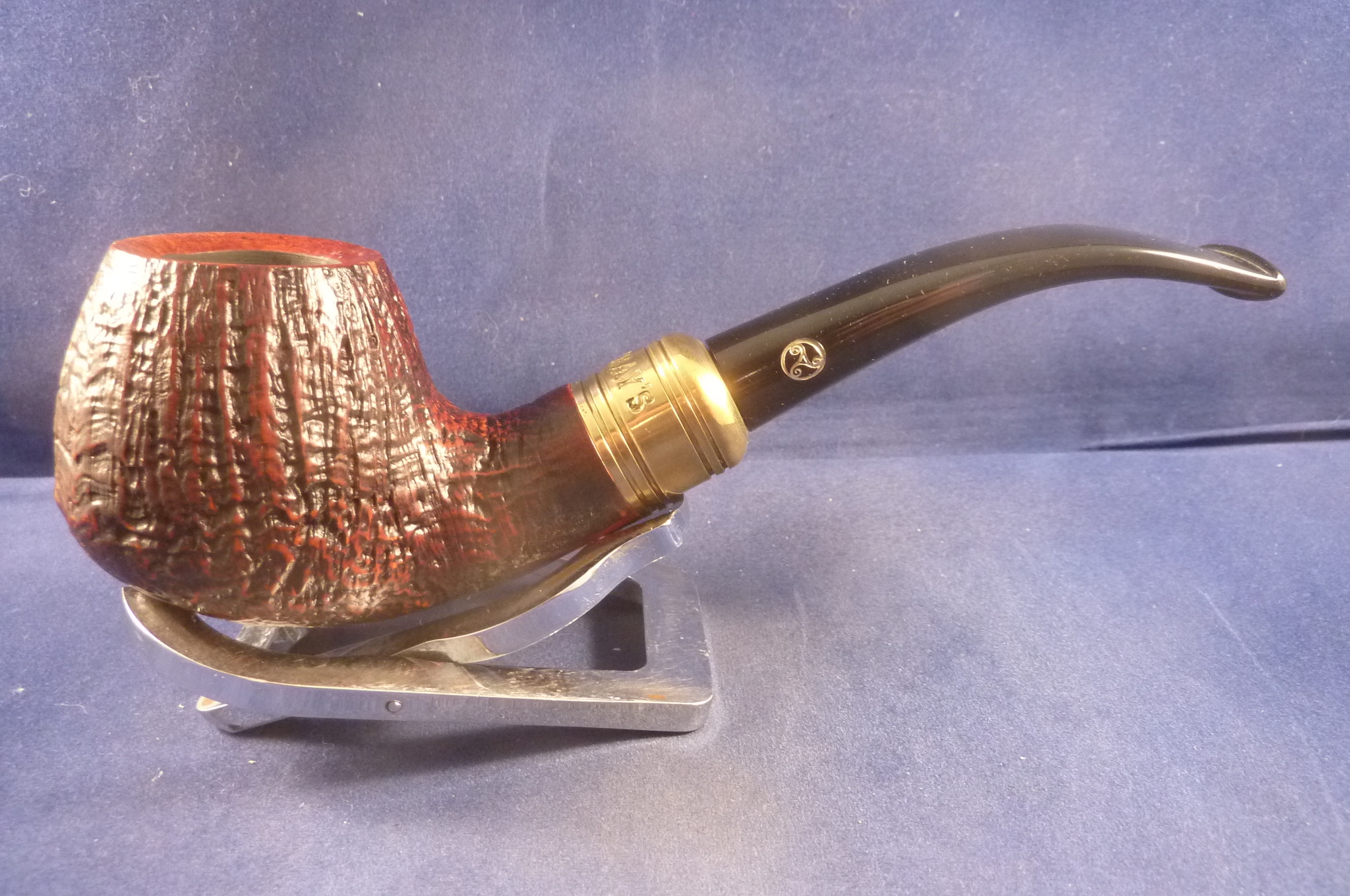 Sandblasted briar pipe with a brass application made for Rattray's. Black acrylic mouthpiece, 9 mm. filter.