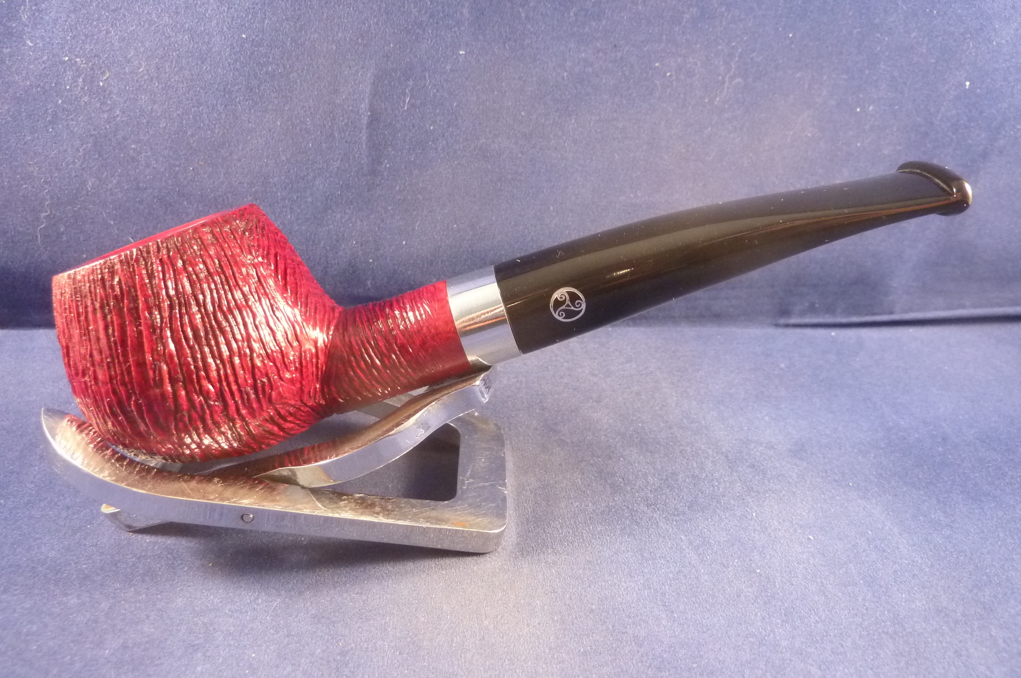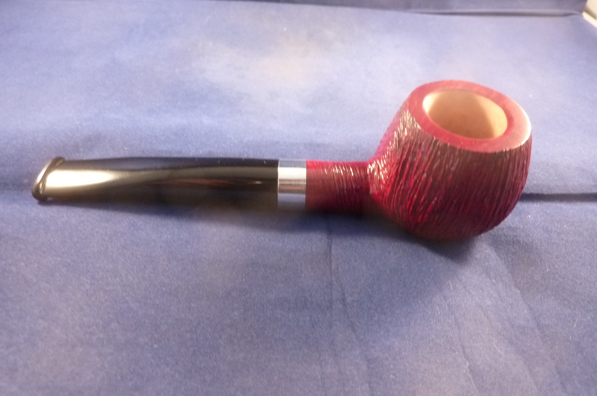Brushed red briar pipe with a metal ring made for Rattray's. Black acrylic mouthpiece, 9 mm. filter.
