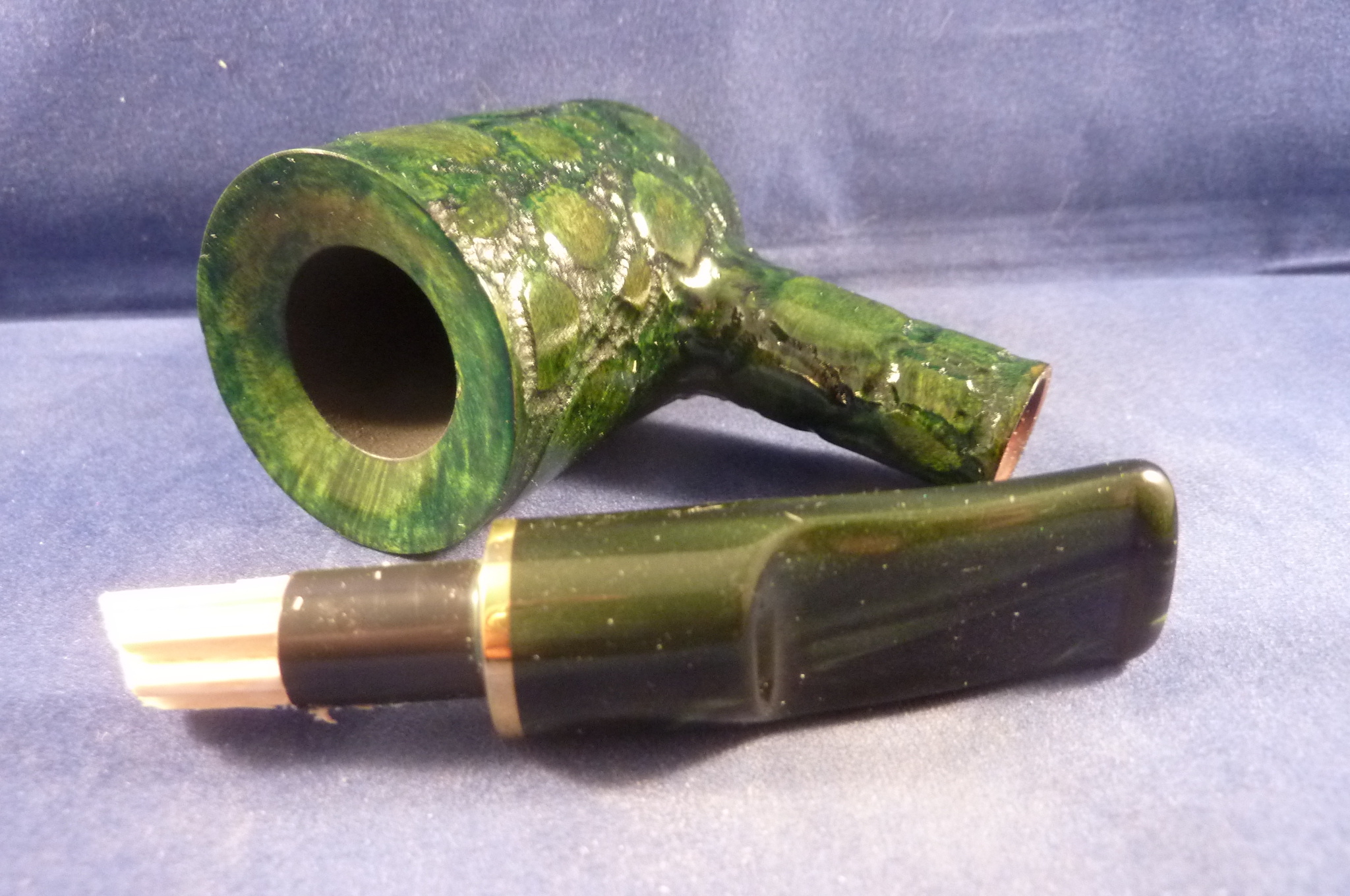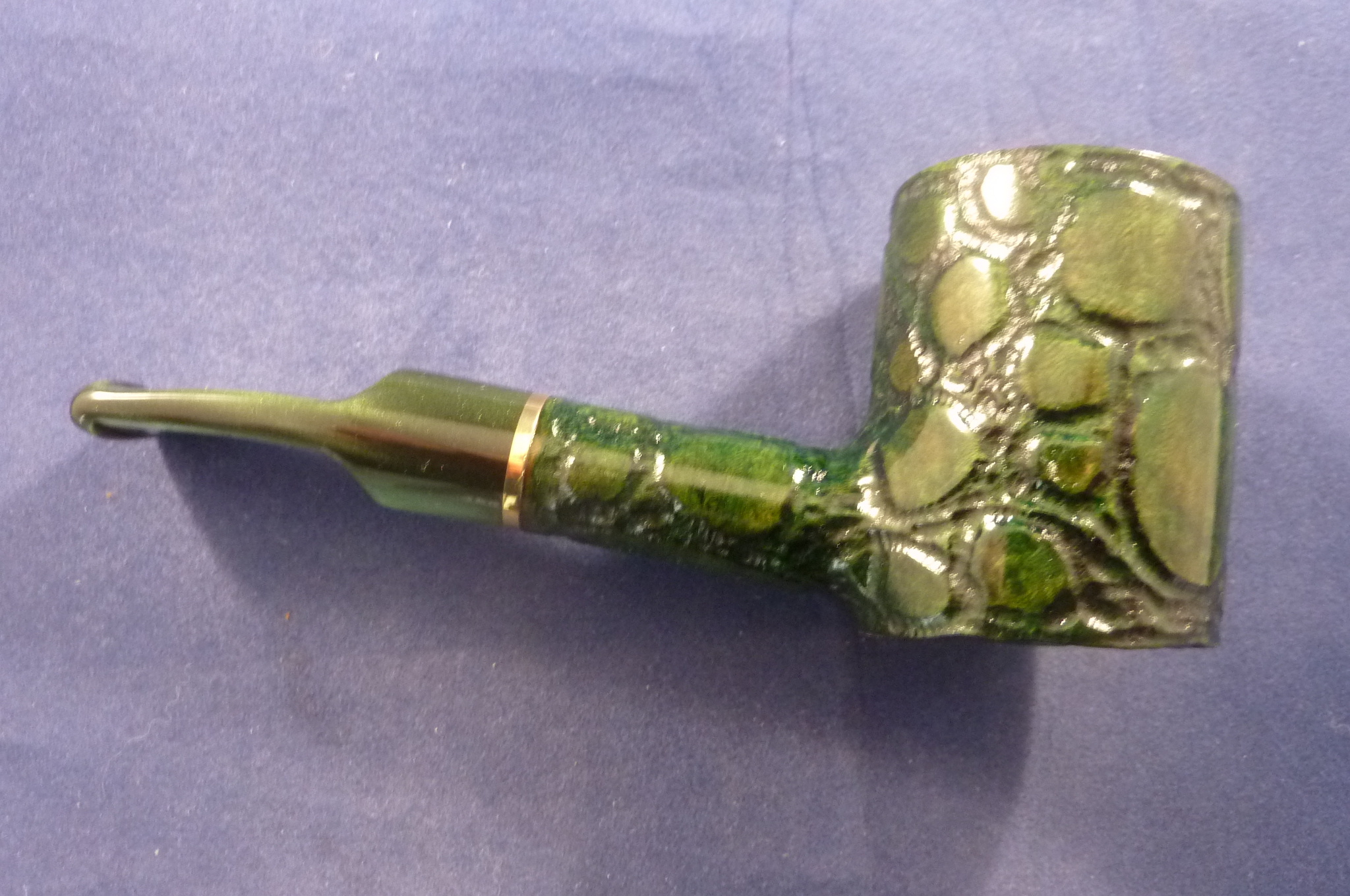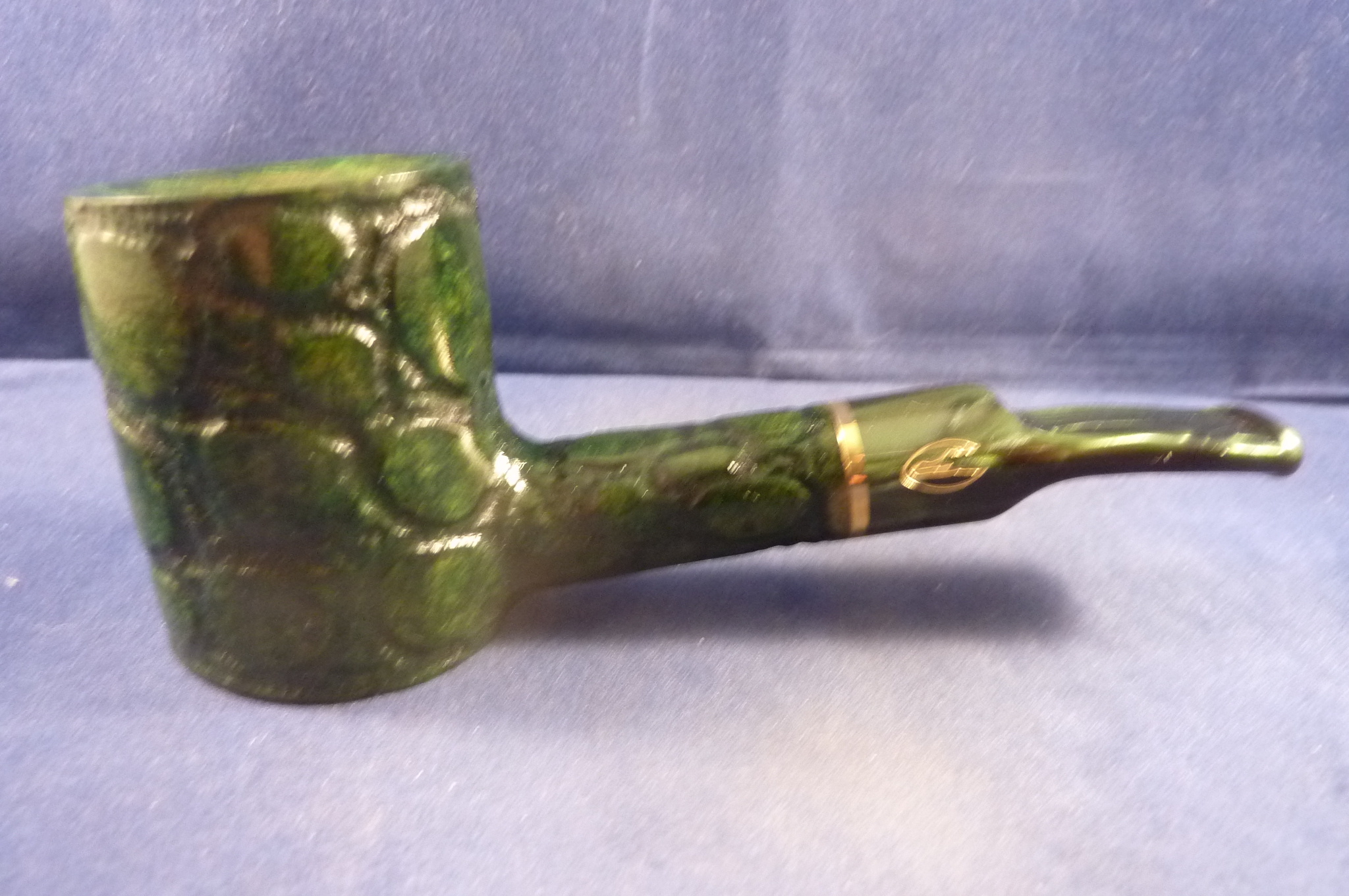 Italian rusticated briar pipe with some smooth parts, that make it look like the skin of a crocodile made by Savinelli. Acrylic green mouthpiece. This pipe is made of high quality briar. 9 mm. filters or you can use the famous Balsa system.