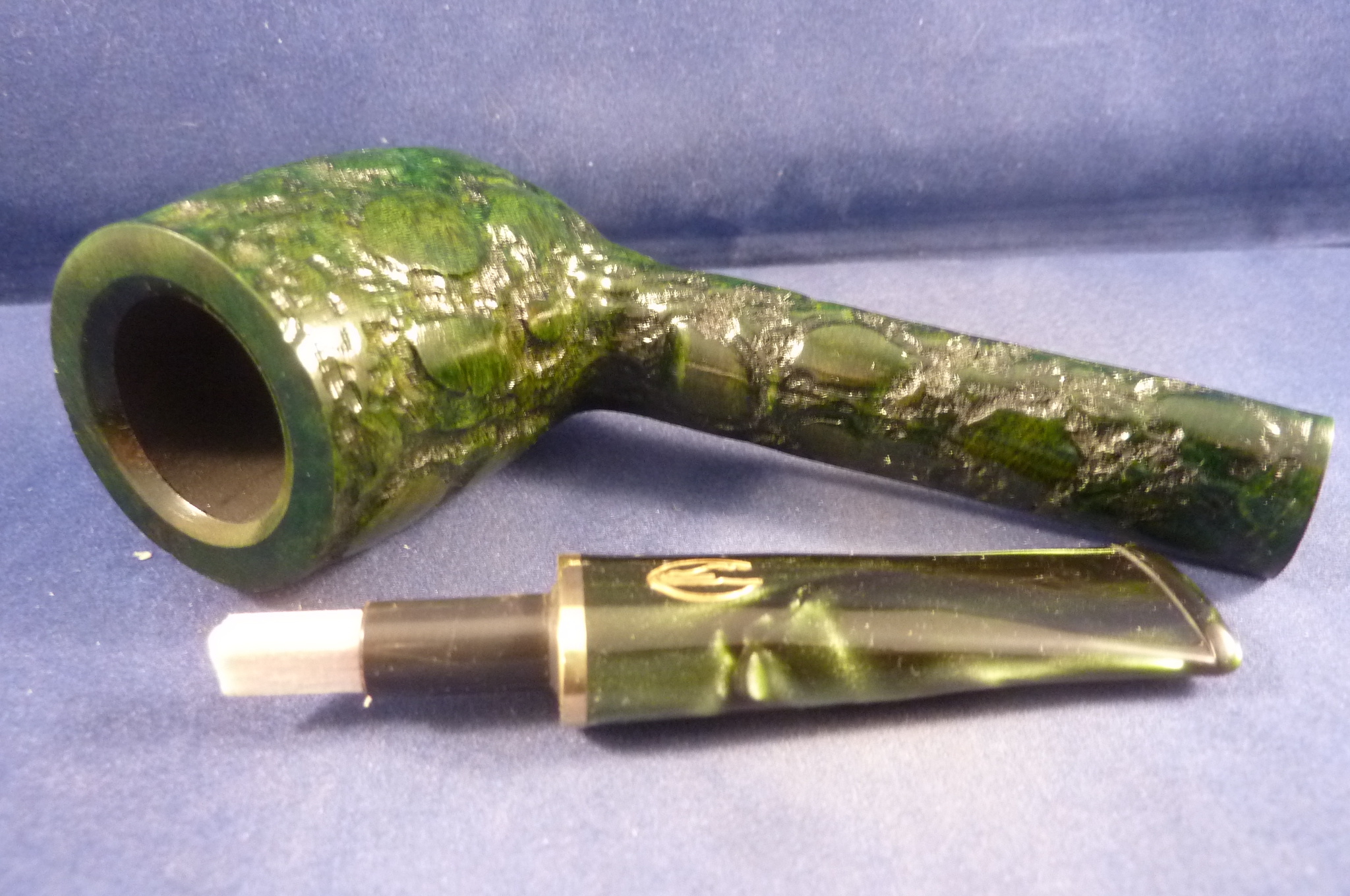 Italian rusticated briar pipe with some smooth parts, that make it look like the skin of a crocodile made by Savinelli. Acrylic green mouthpiece. This pipe is made of high quality briar. 6 mm. filters or you can use the famous Balsa system.
