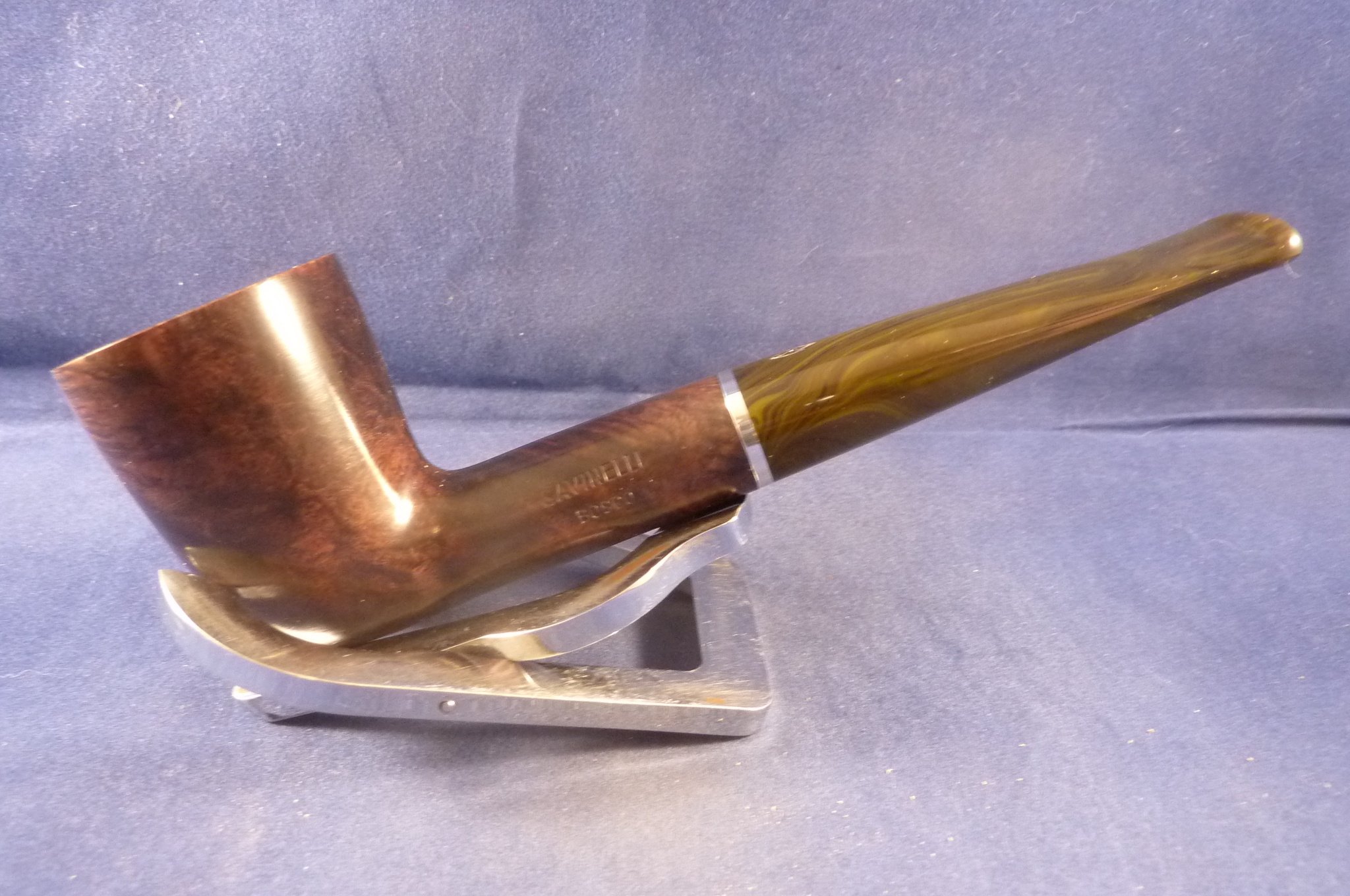 Smooth briar pipe in a warm brown finish made by Savinelli in Italy. Coloured acrylic mouthpiece, 9 mm. filters or you can use the famous Balsa system.