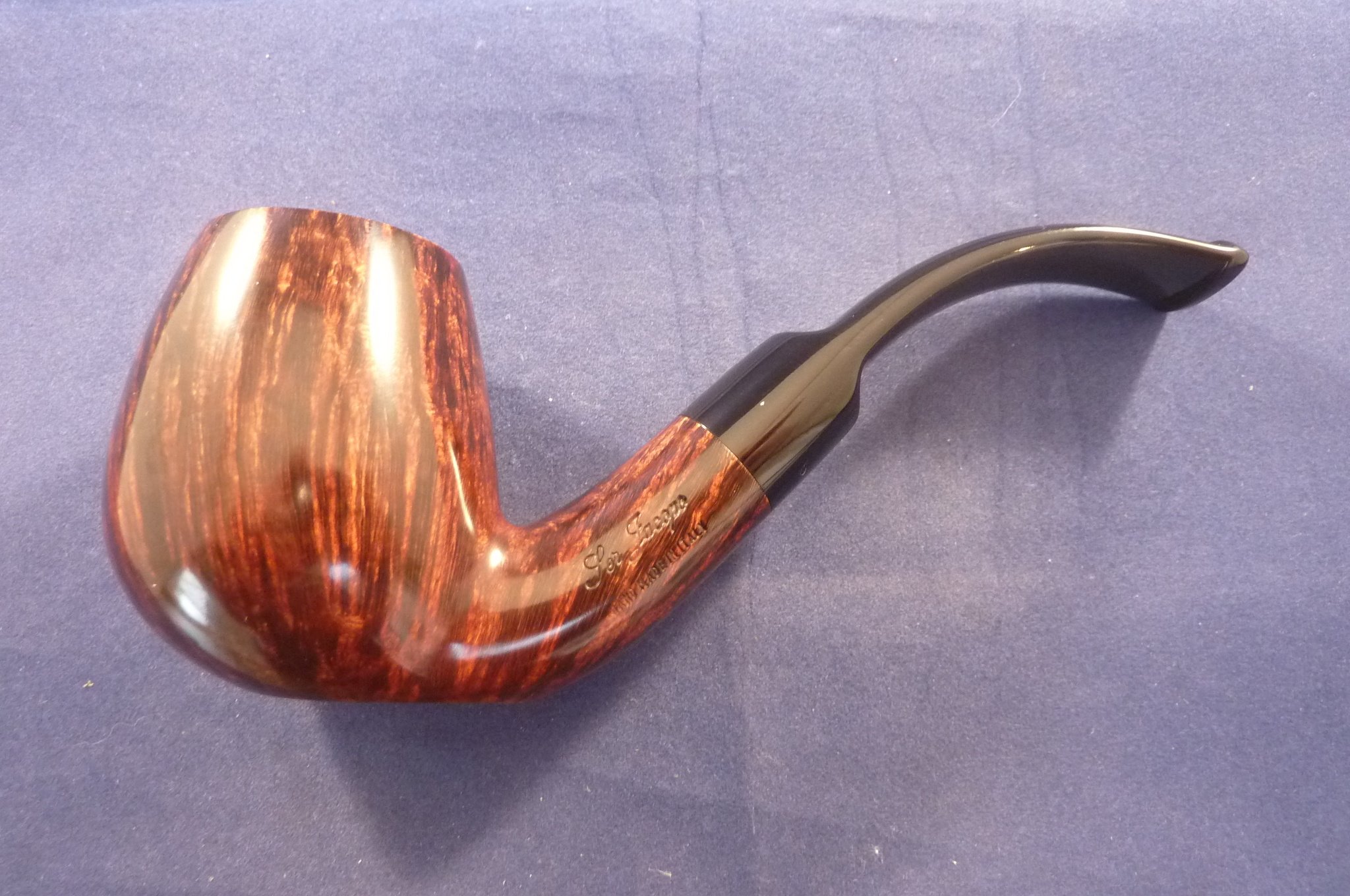 This is a brand new pipe made by Ser Jacopo in Italy. This company has some fine craftsmen, which produce beautiful handmade pipes with great designs and shapes. This smooth briar pipe has an elegant shape. Black mouthpiece, 9 mm. filter.