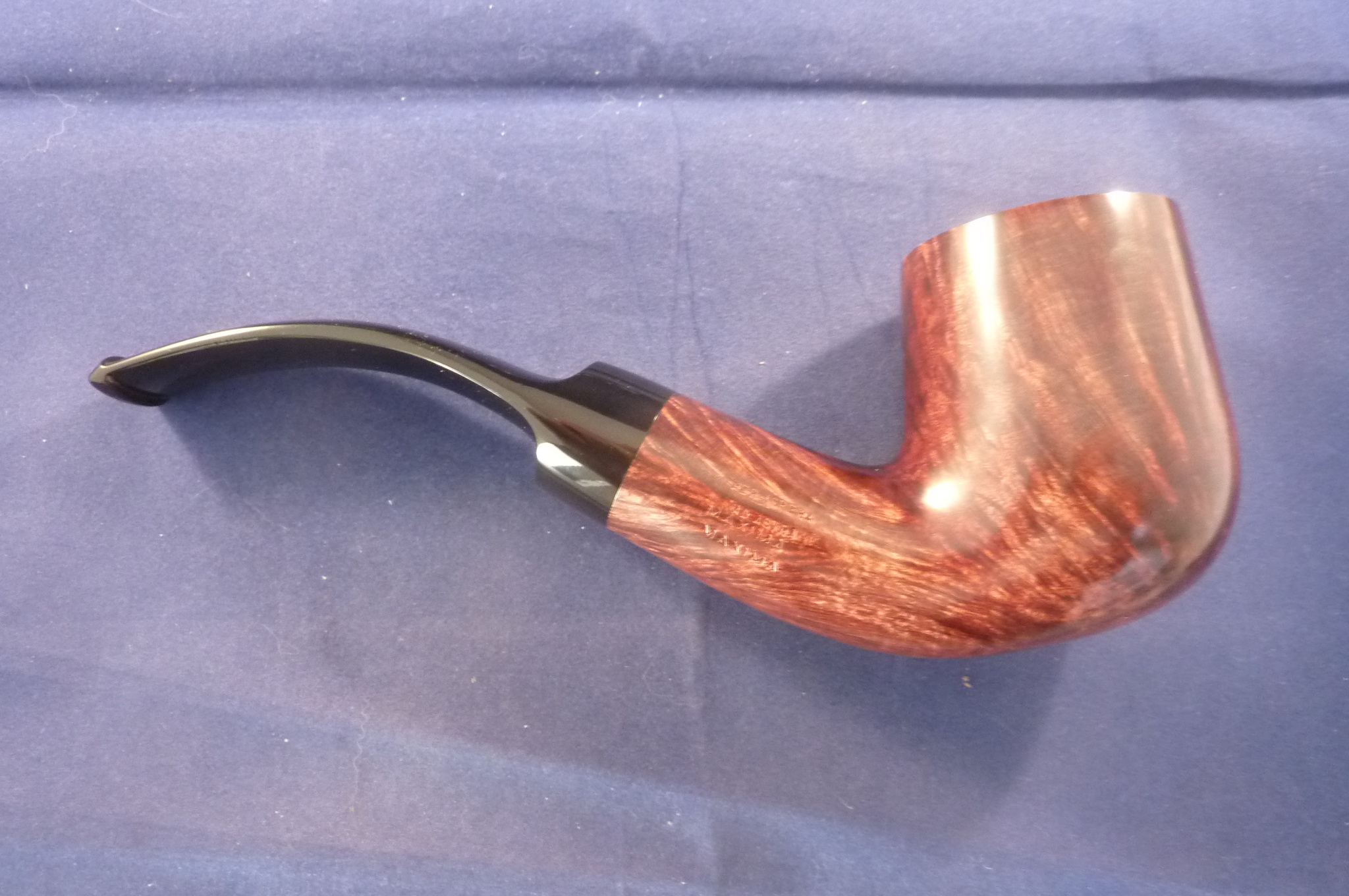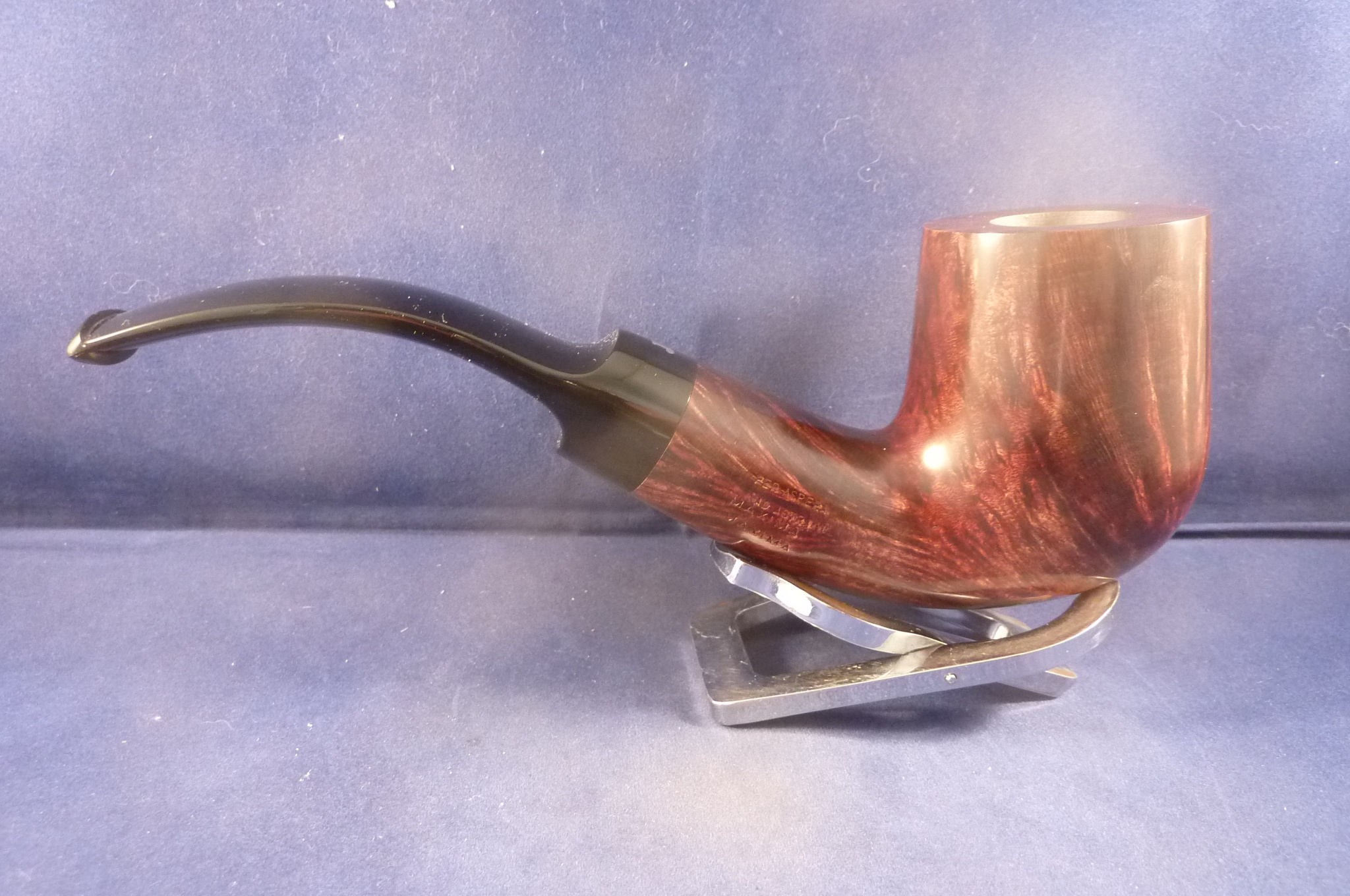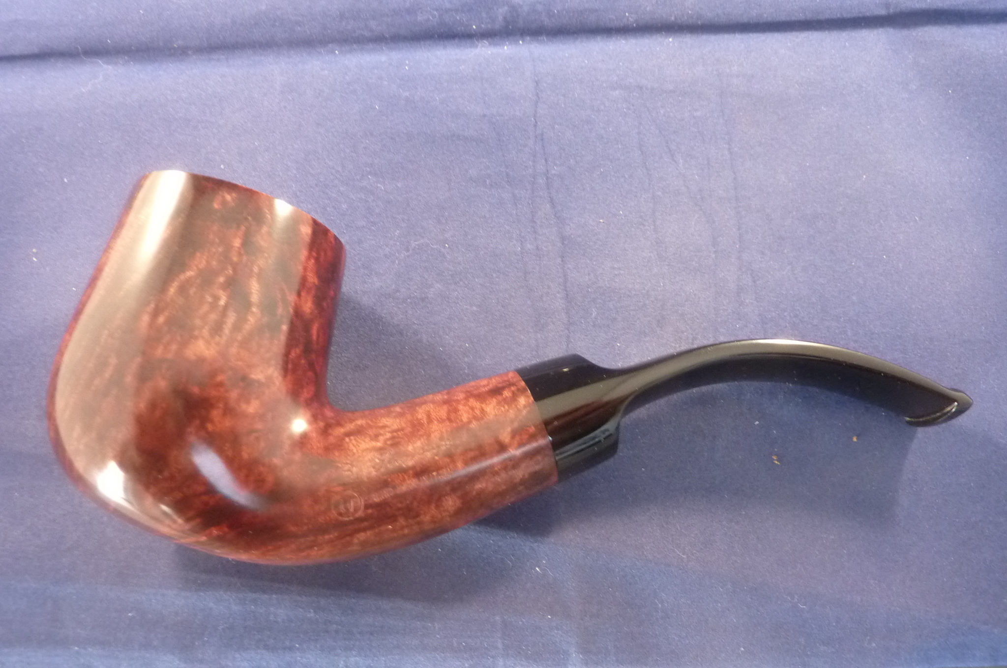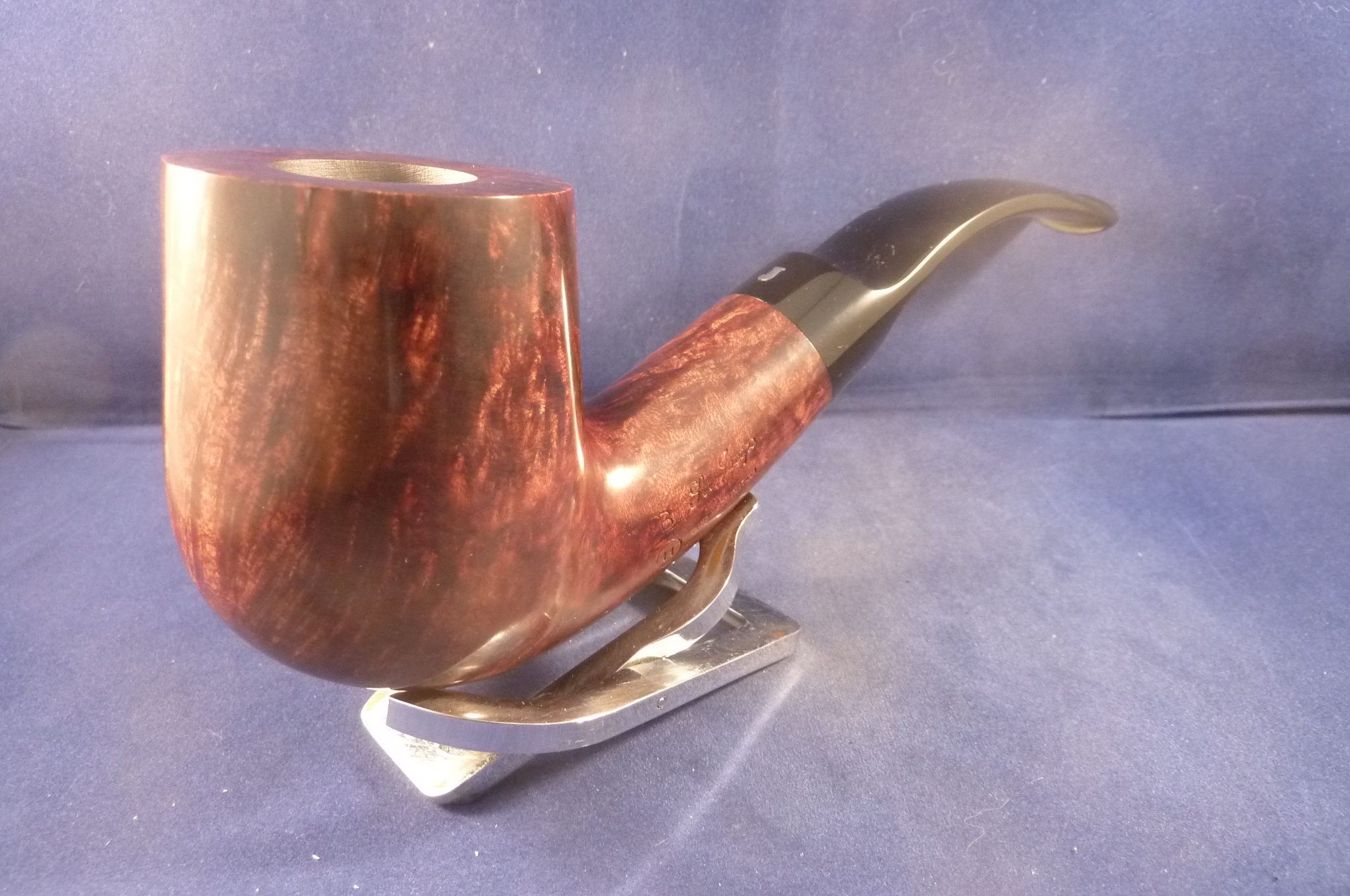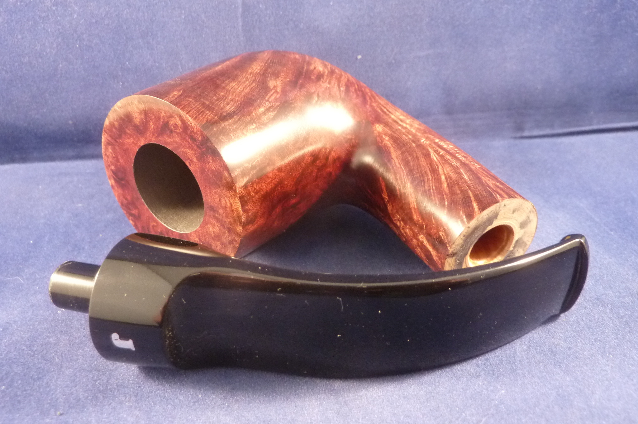 This is a brand new pipe made by Ser Jacopo in Italy. This company has some fine craftsmen, which produce beautiful handmade pipes with great designs and shapes. This smooth briar pipe has a giant bent billiard shape. Black mouthpiece, without filter.