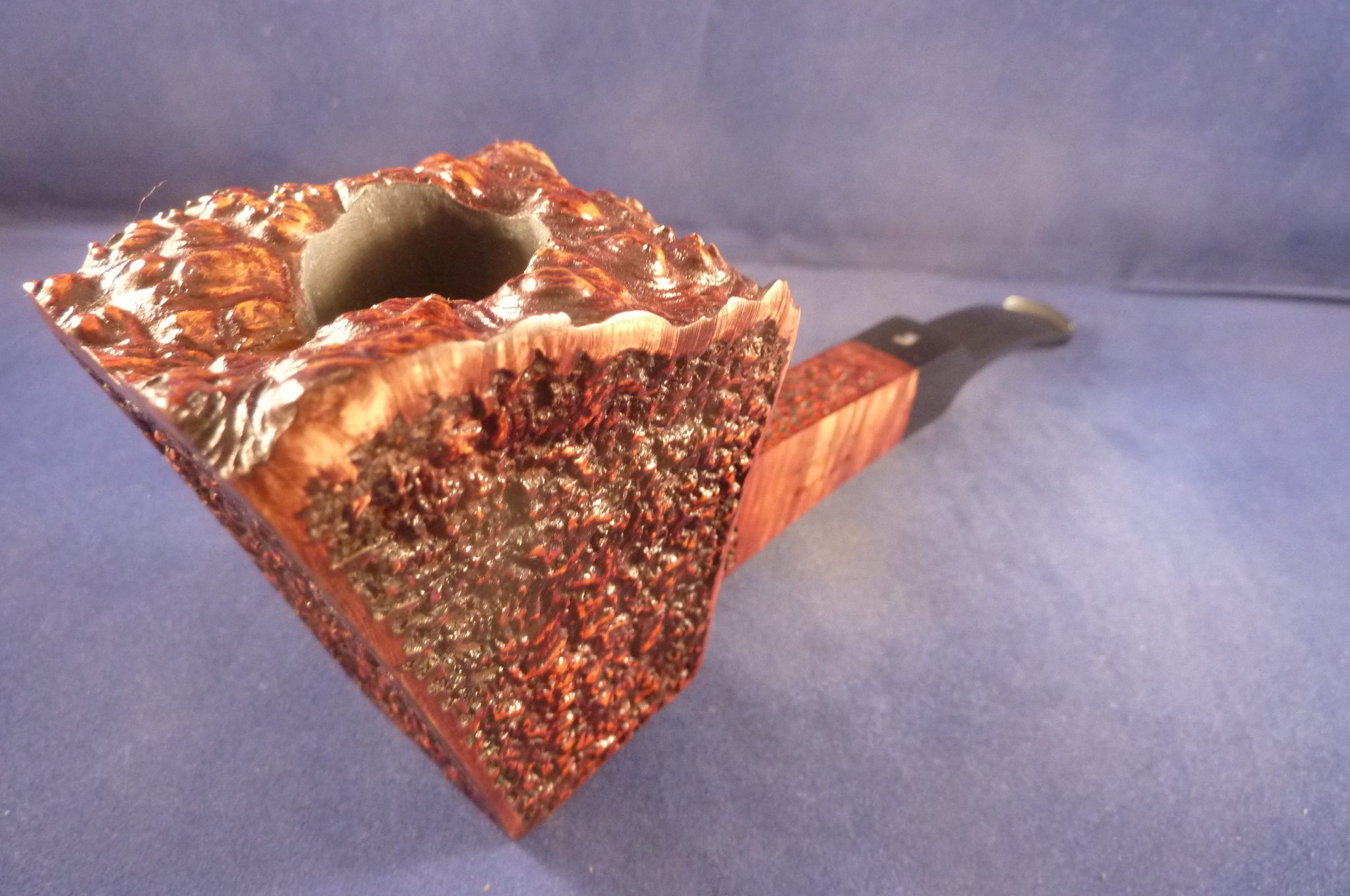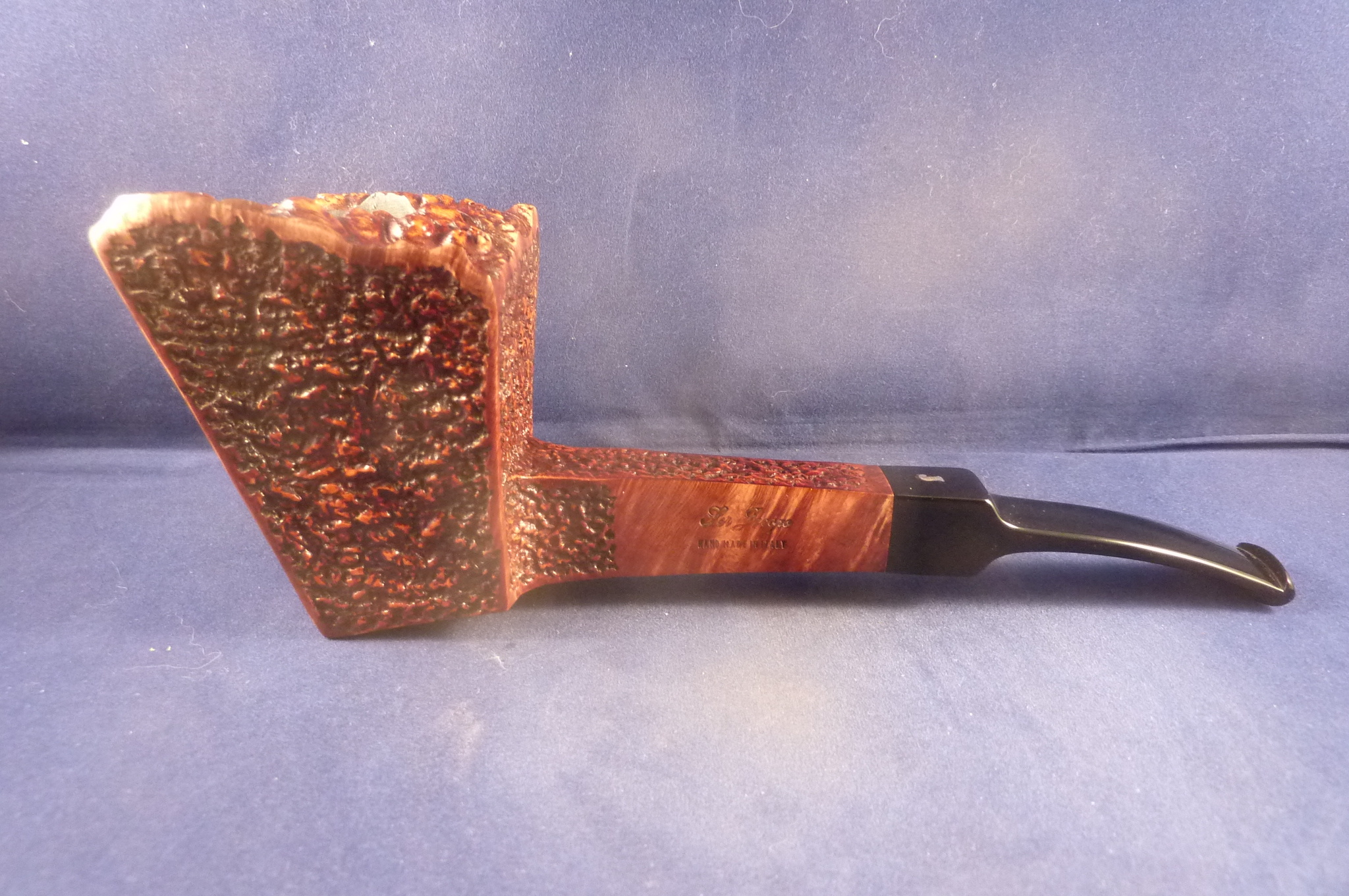 This is a brand new pipe made by Ser Jacopo in Italy. This company has some fine craftsmen, which produce beautiful handmade pipes with great designs and shapes. This giant rusticated briar pipe can stand alone. Acrylic mouthpiece, without filter.