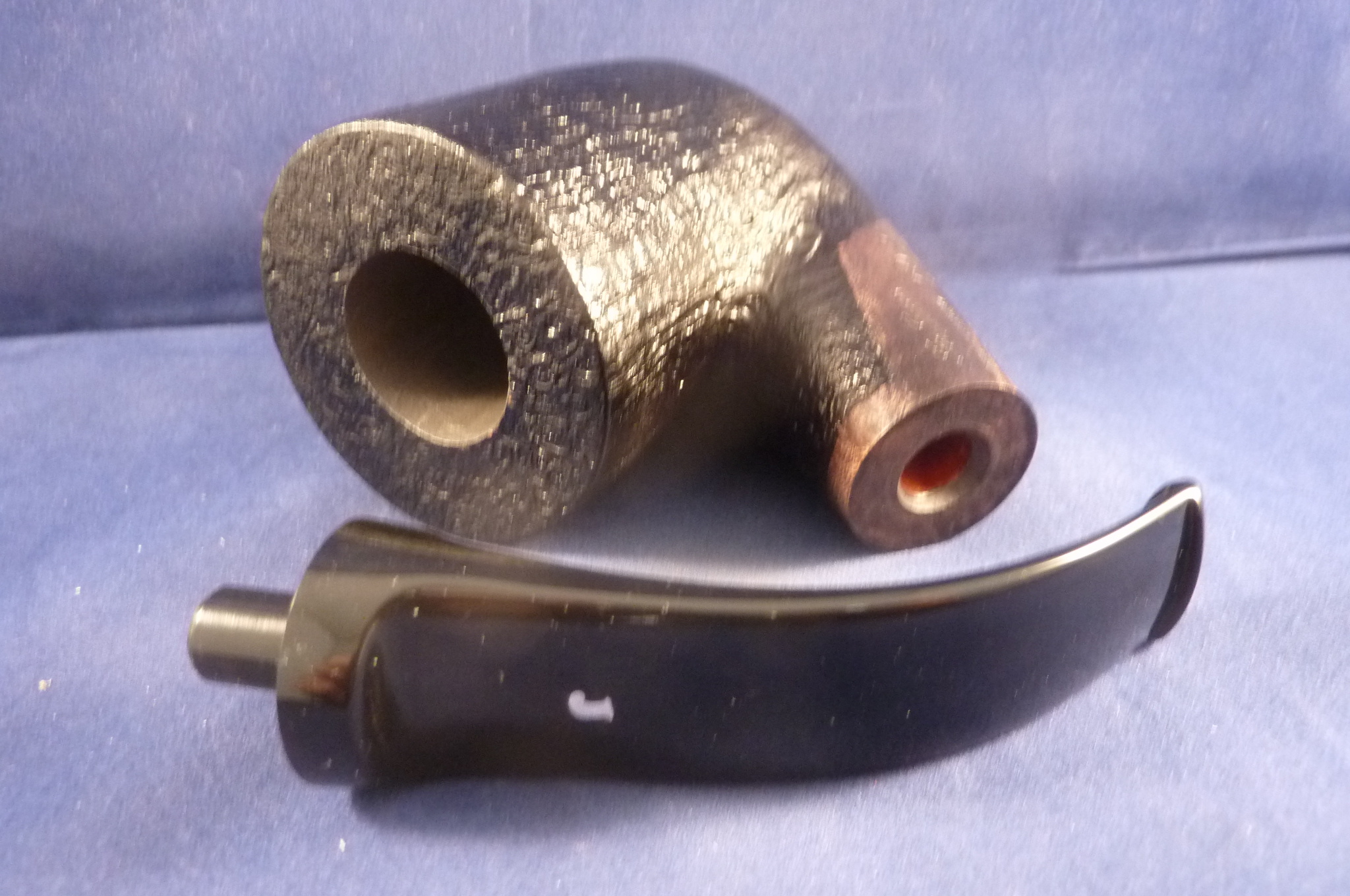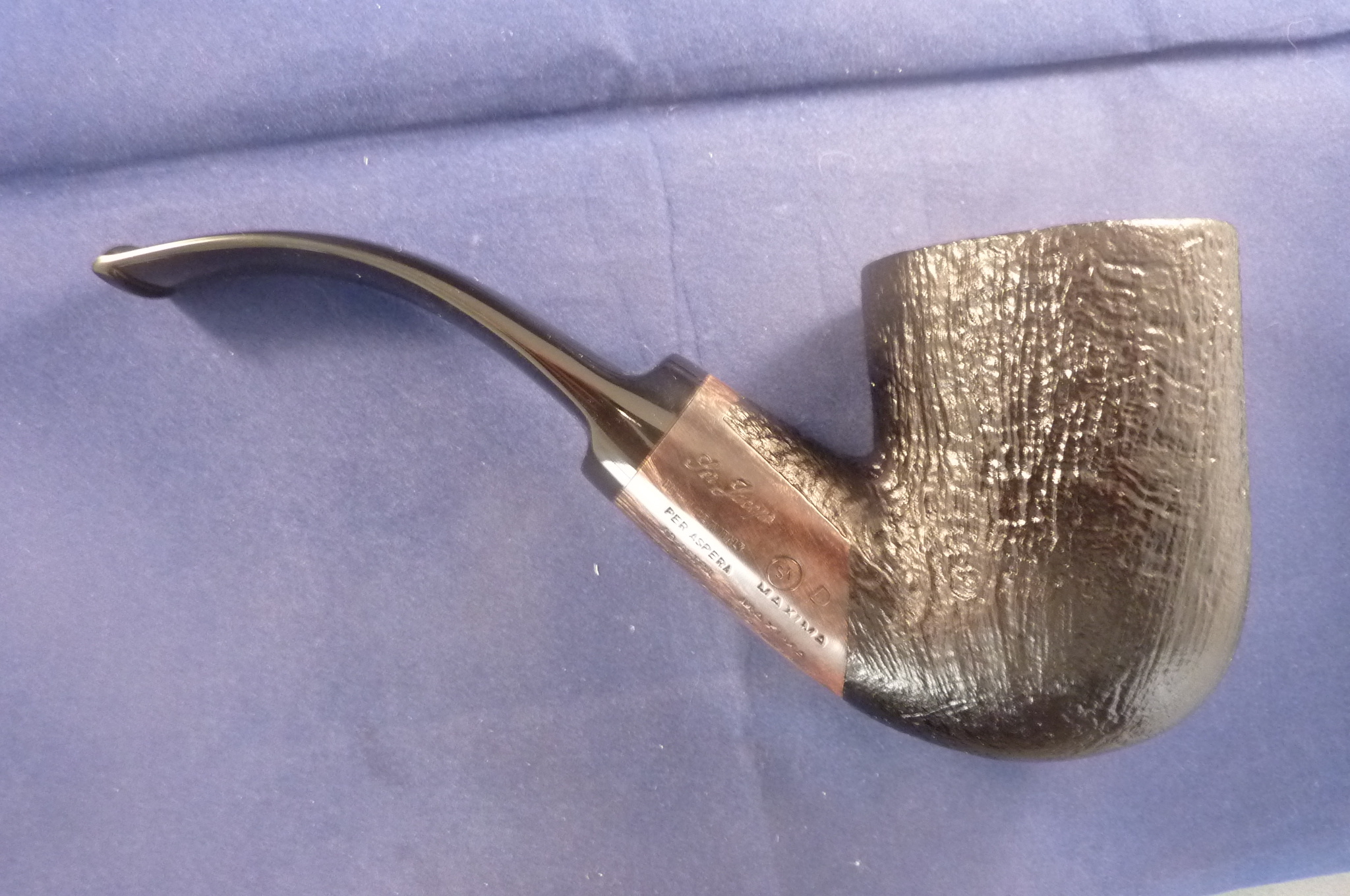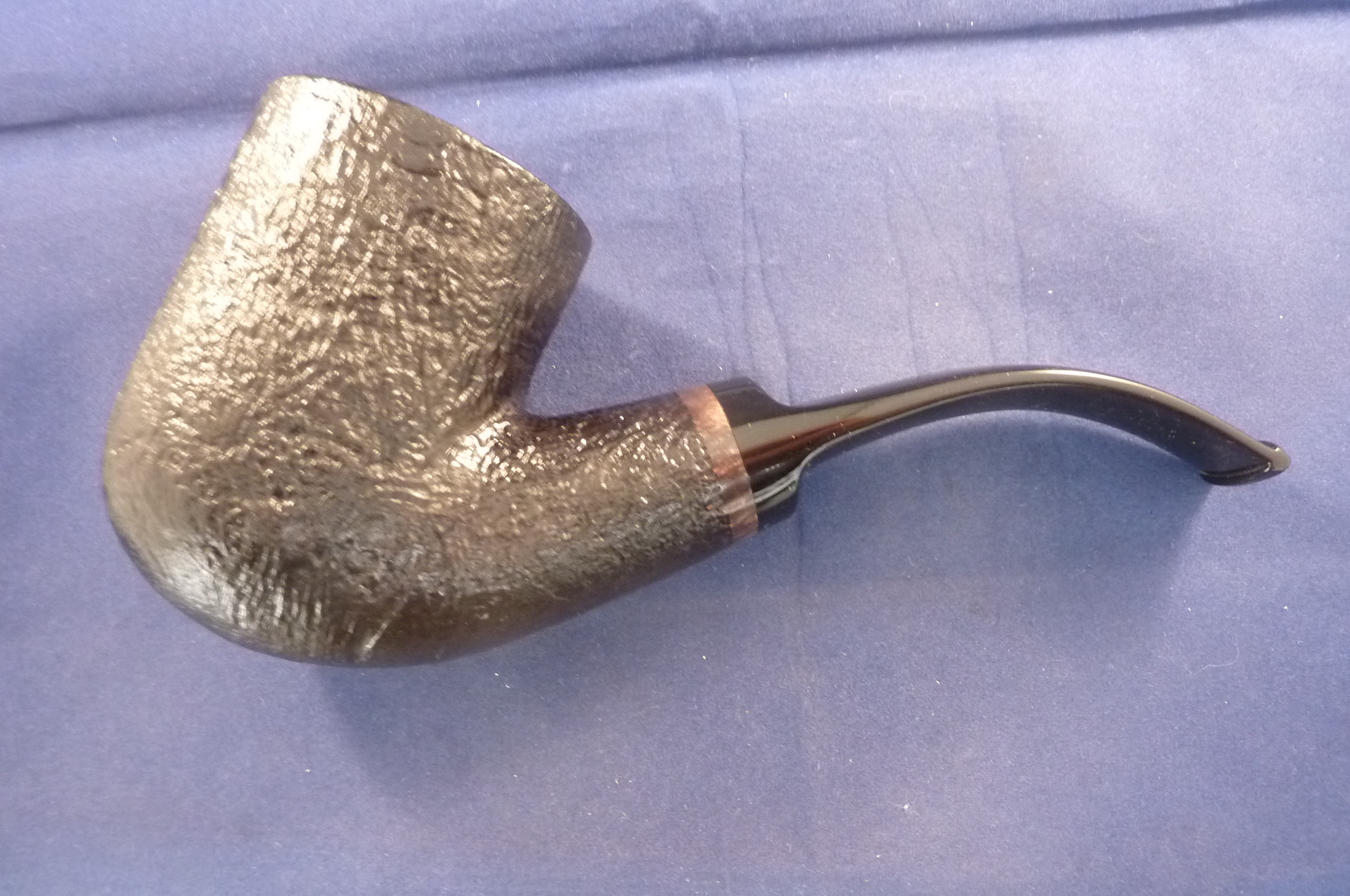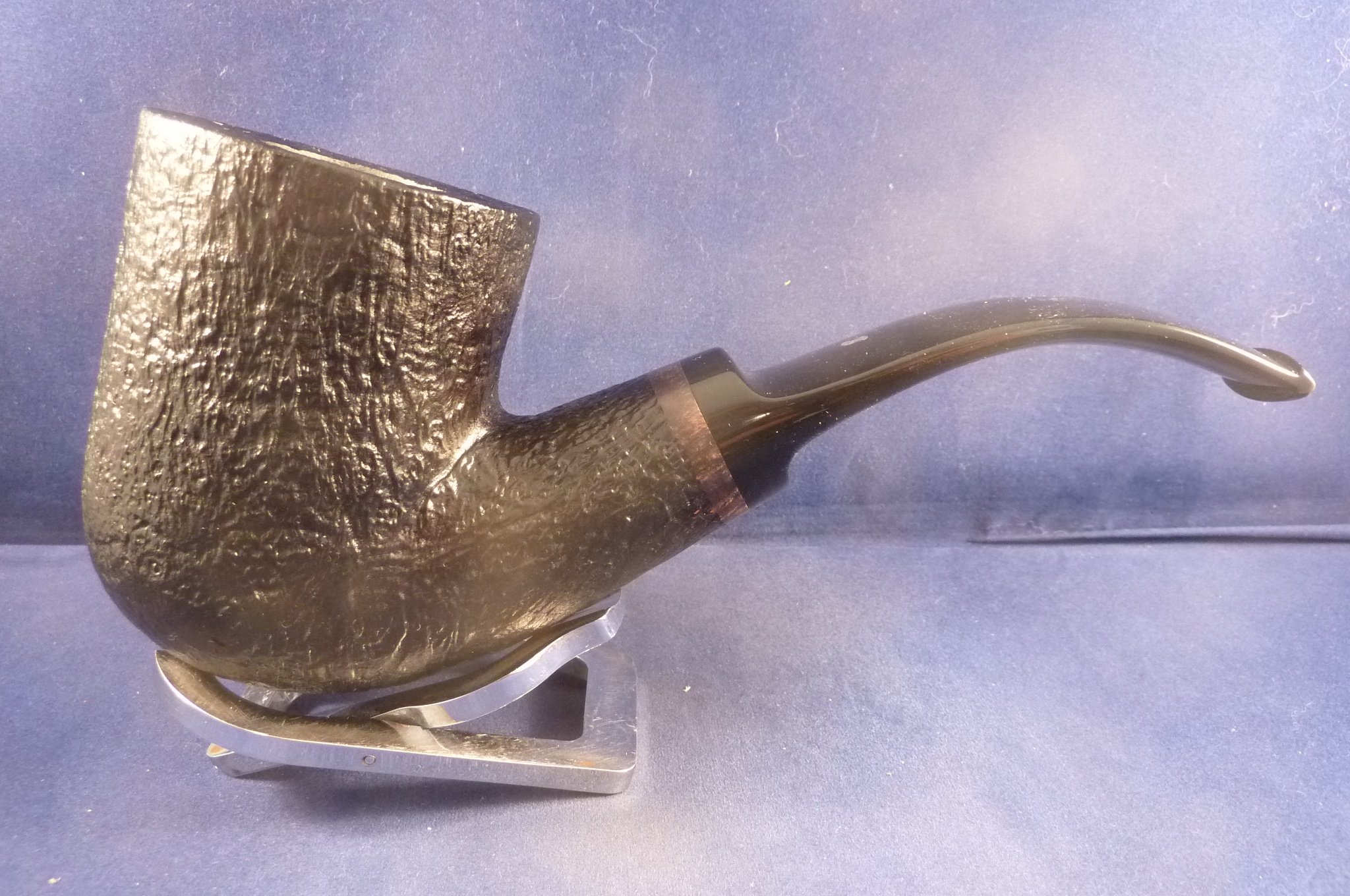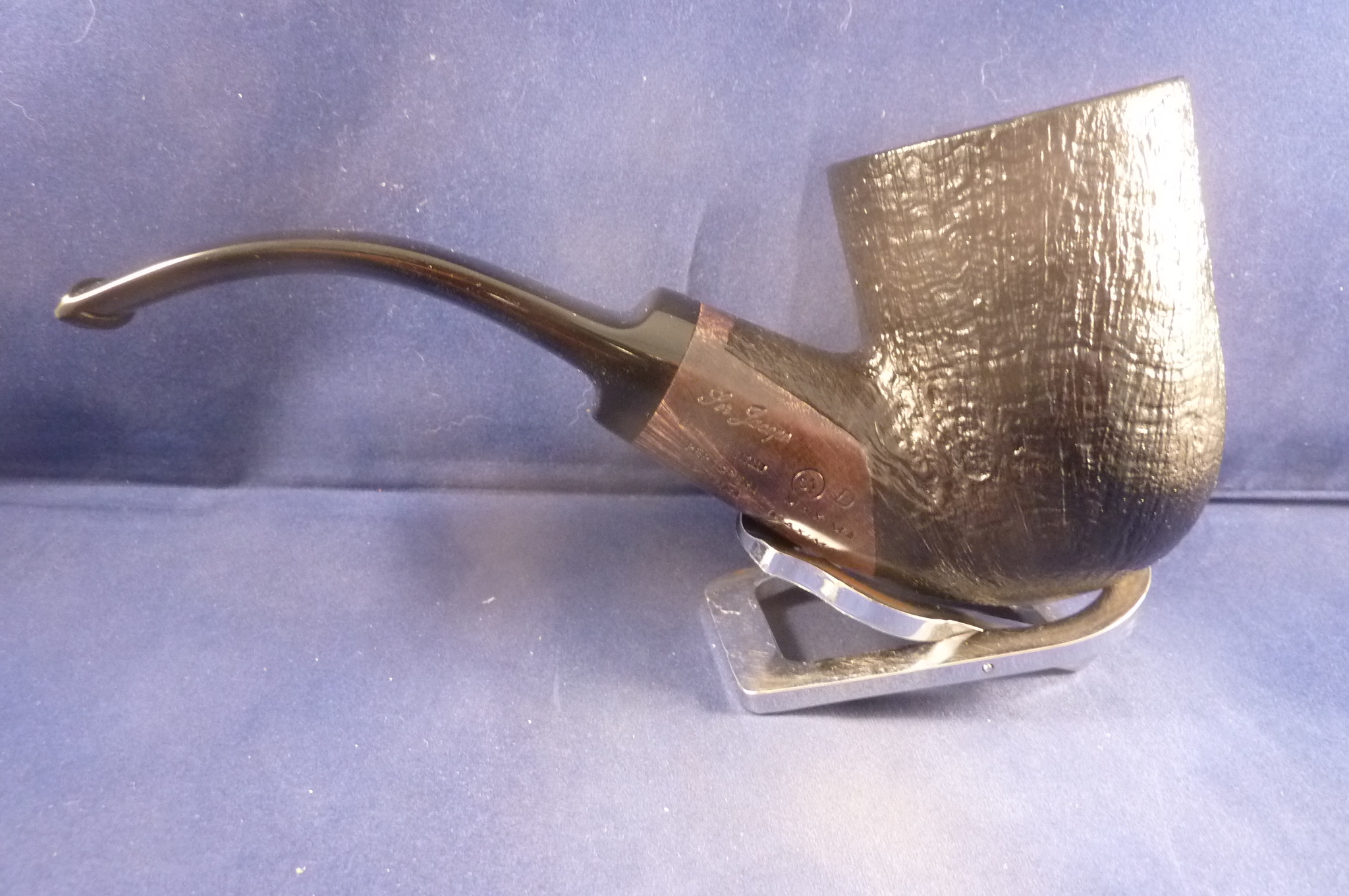 This is a brand new pipe made by Ser Jacopo in Italy. This company has some fine craftsmen, which produce beautiful handmade pipes with great designs and shapes. This giant sandblasted briar pipe has a beautiful shape. Black acrylic mouthpiece, 9 mm. filter.