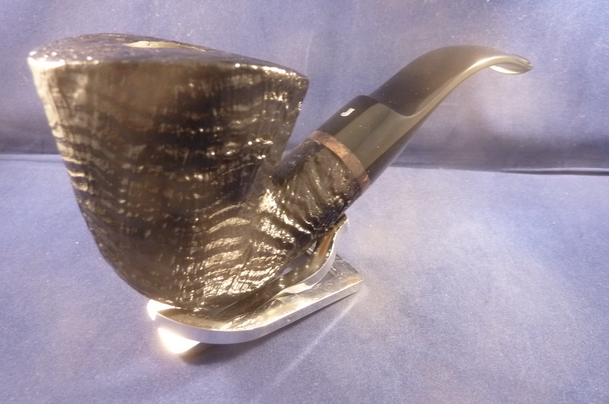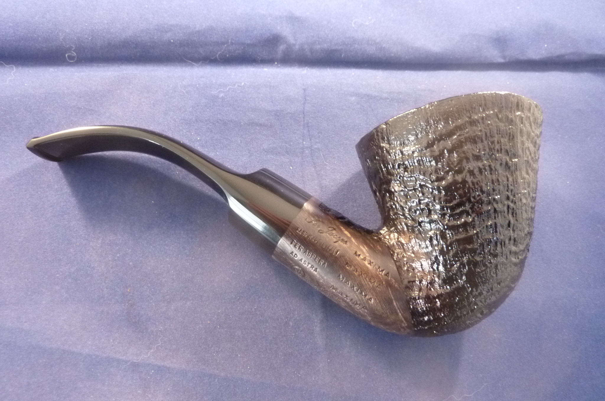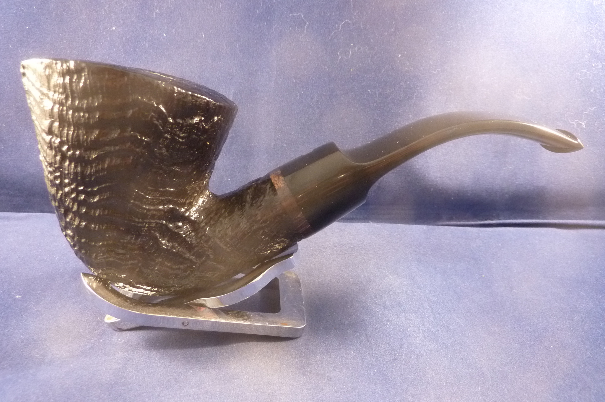 This is a brand new pipe made by Ser Jacopo in Italy. This company has some fine craftsmen, which produce beautiful handmade pipes with great designs and shapes. This sandblasted giant briar pipe has a classical shape. Acrylic mouthpiece, without filter.