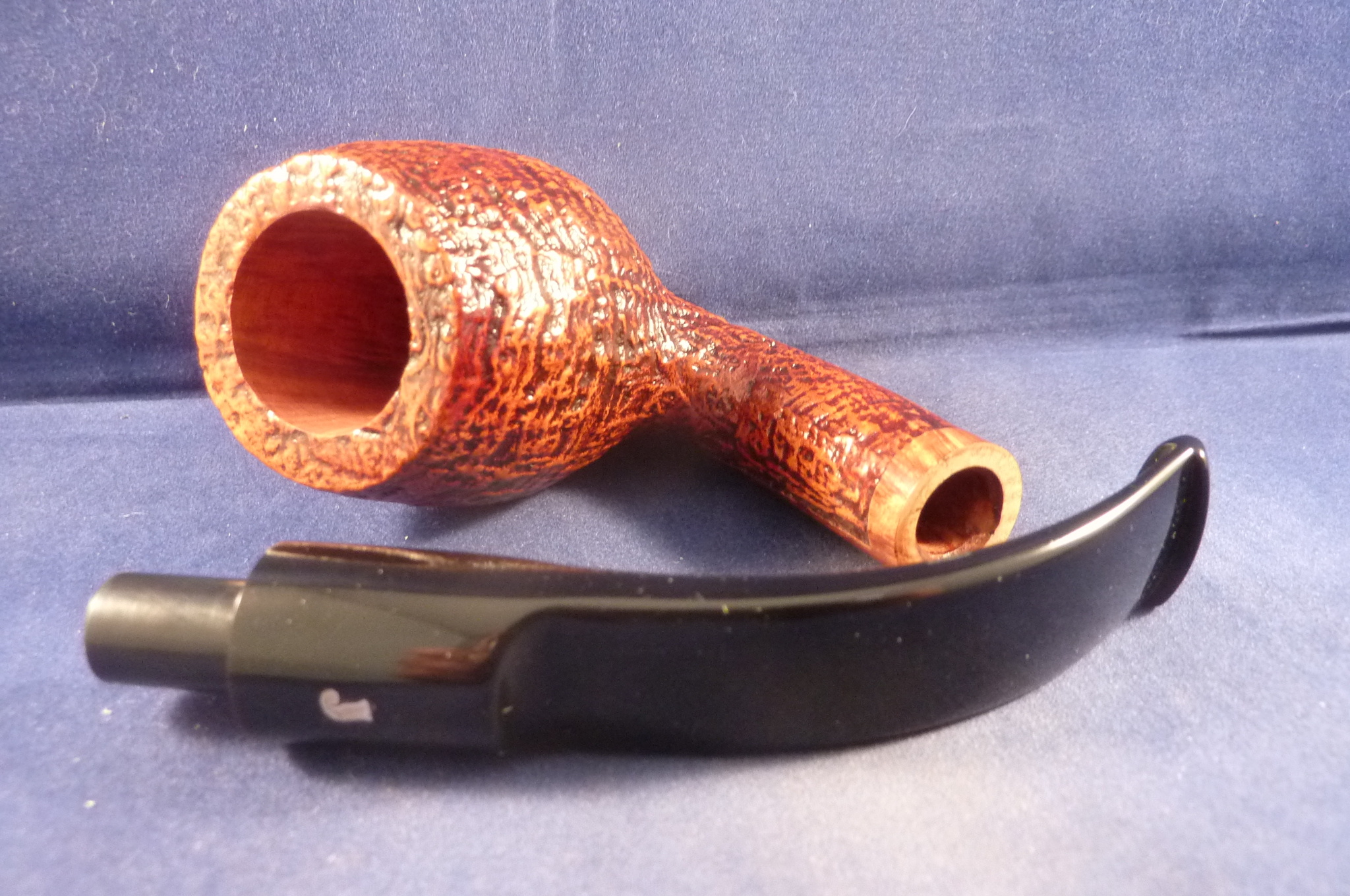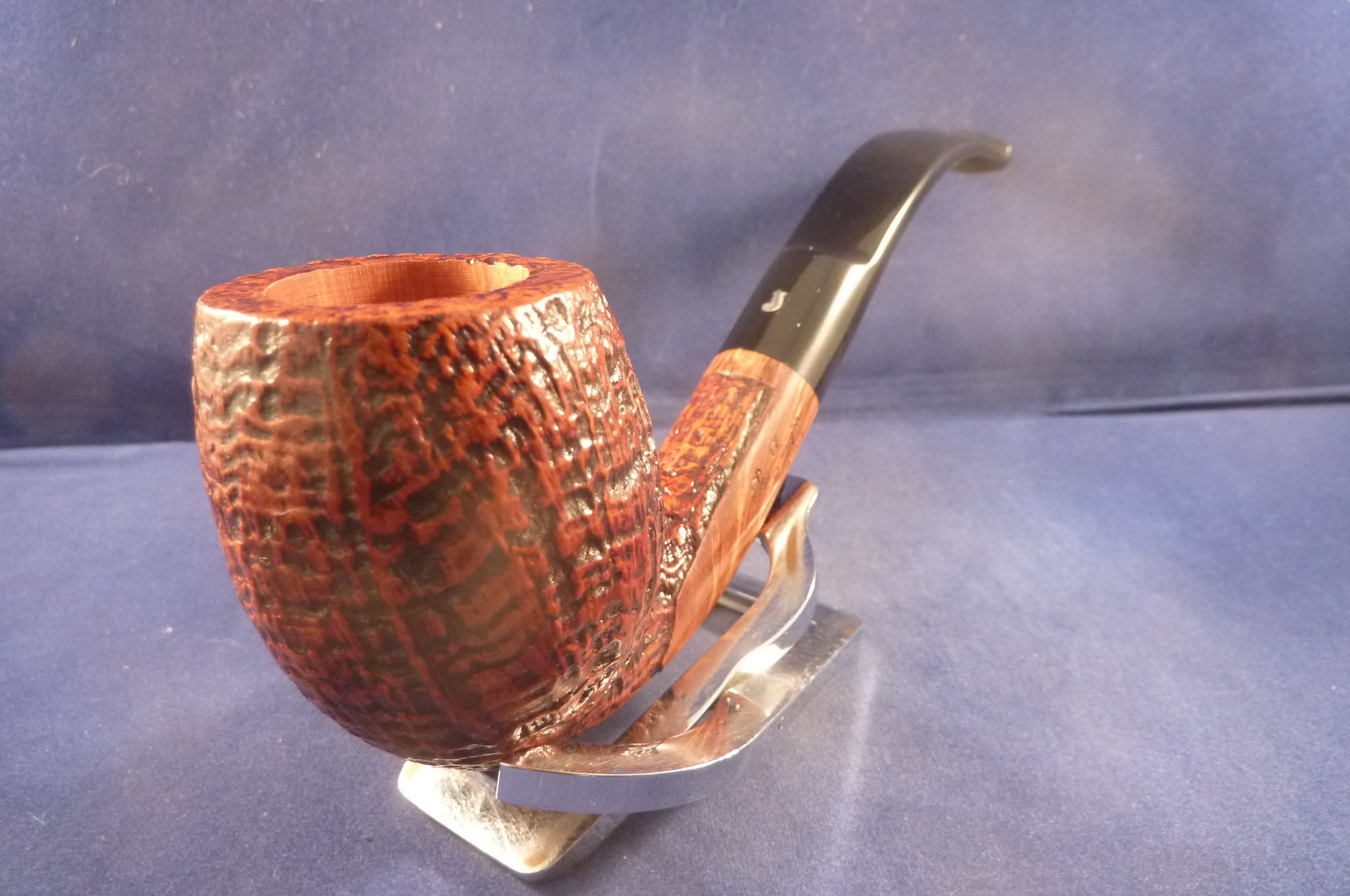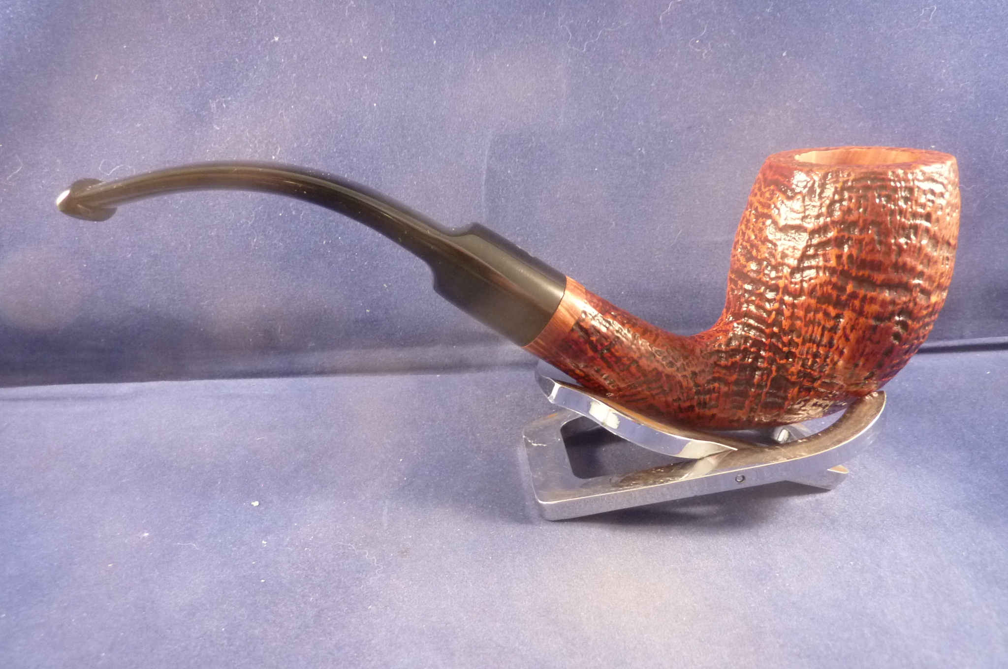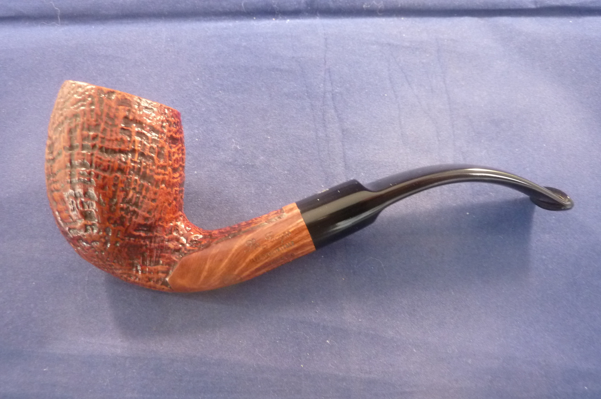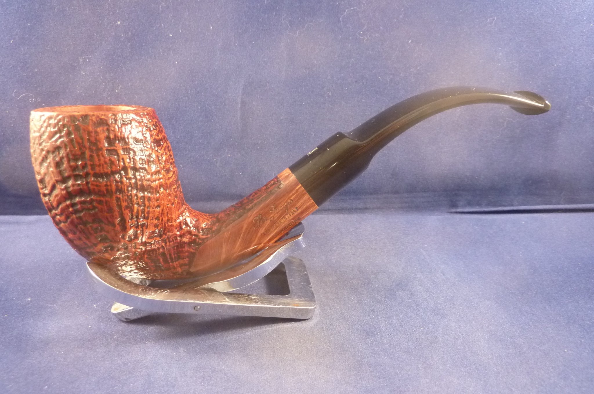 This is a brand new pipe made by Ser Jacopo in Italy. This company has some fine craftsmen, which produce beautiful handmade pipes with great designs and shapes. This sandblasted briar pipe has a beautiful shape. Acrylic mouthpiece, 9 mm. filter.
