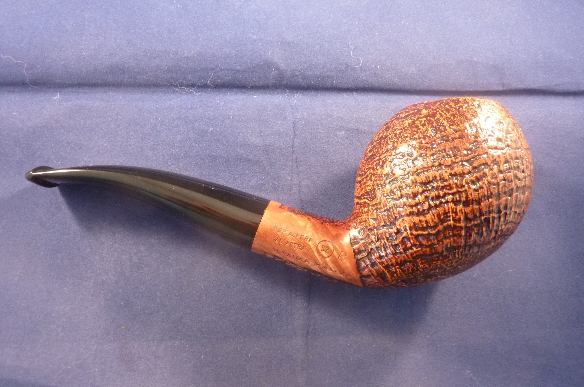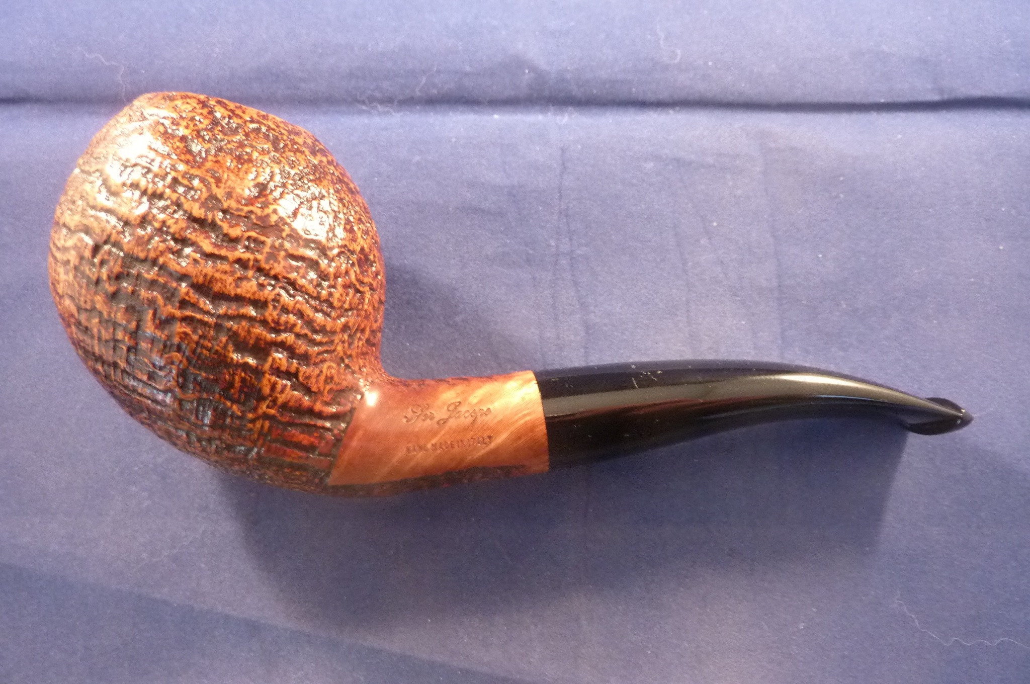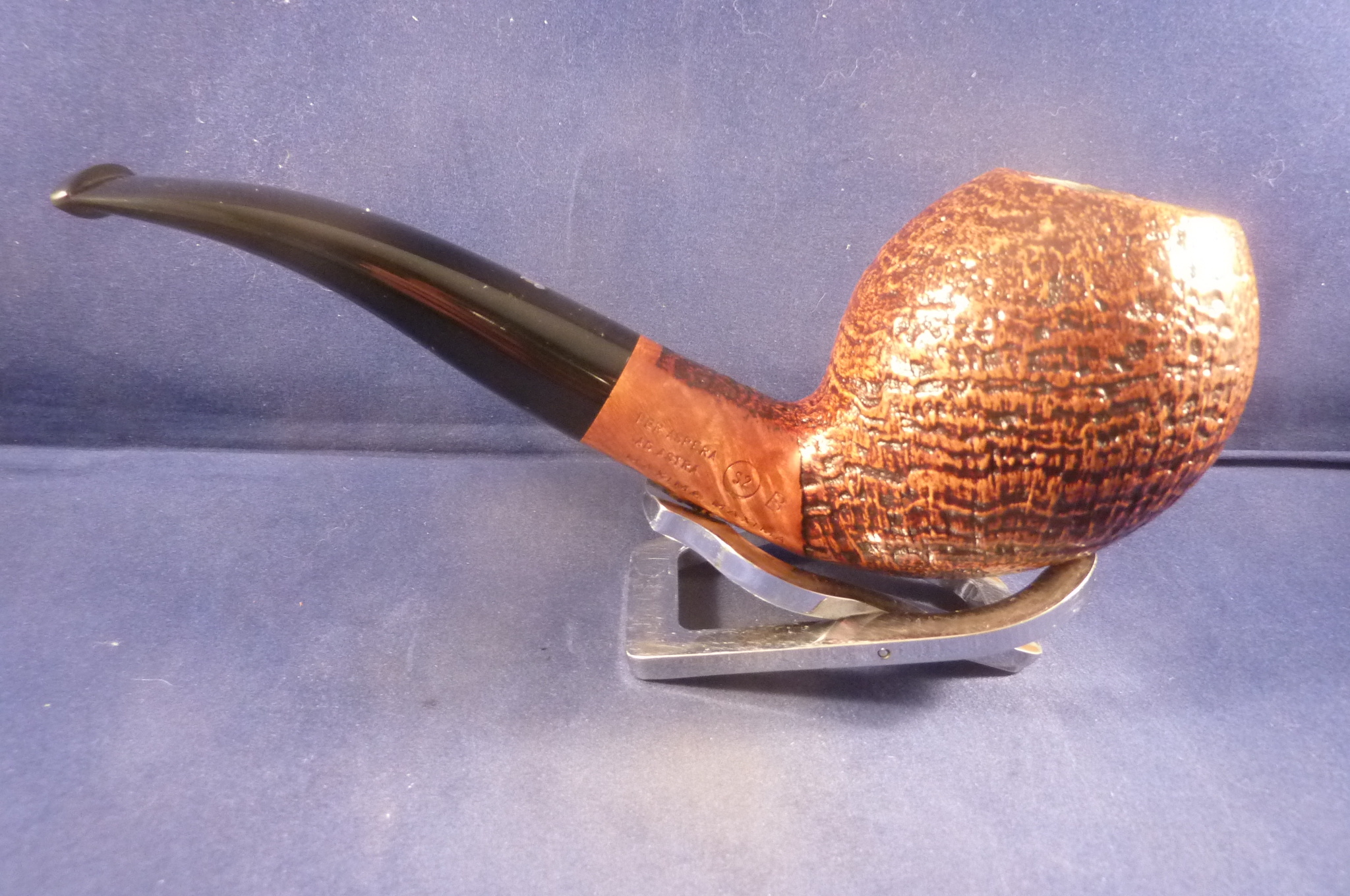 This is a brand new pipe made by Ser Jacopo in Italy. This company has some fine craftsmen, which produce beautiful handmade pipes with great designs and shapes. This giant sandblasted briar pipe has a beautiful shape. Black acrylic mouthpiece, without filter.