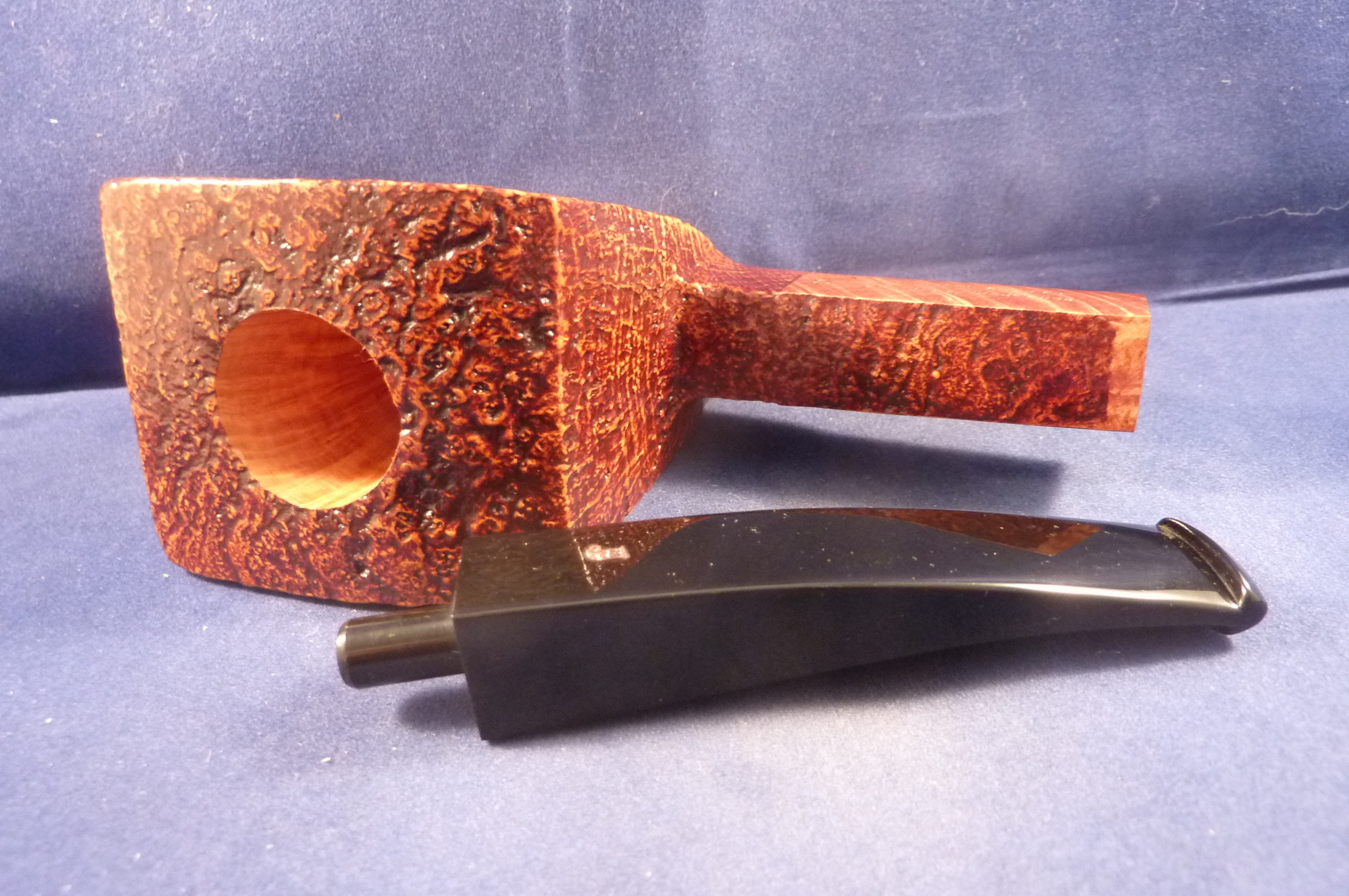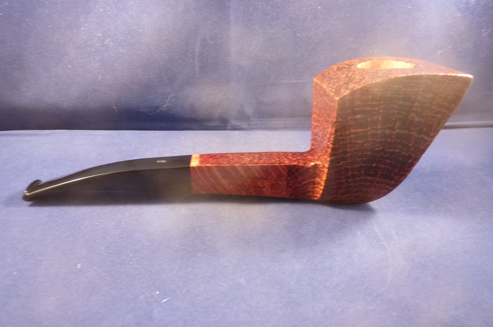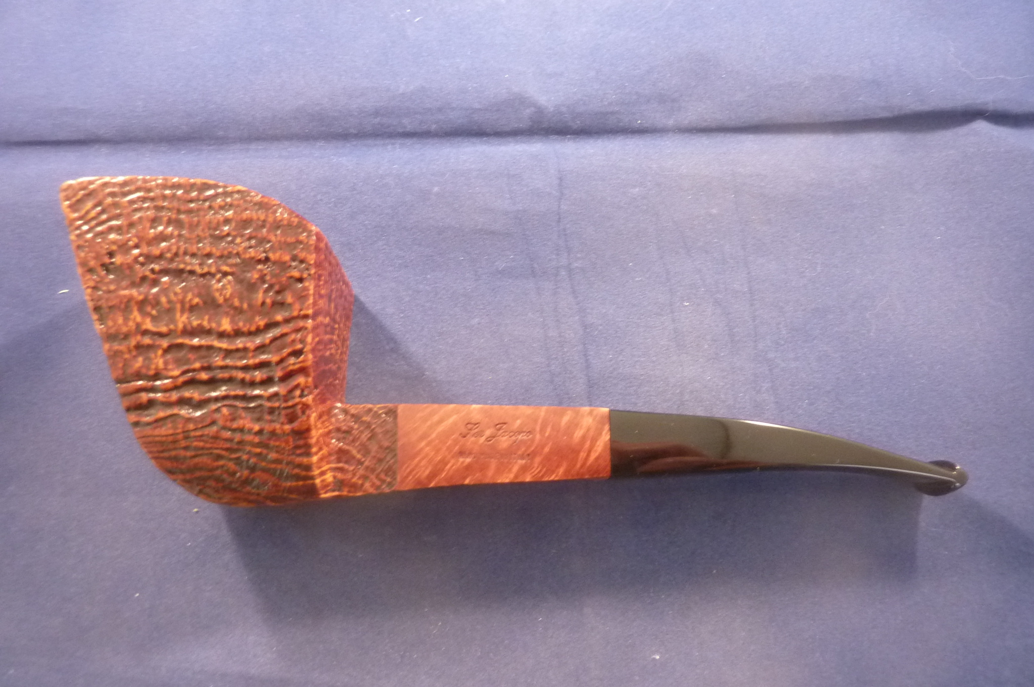 This is a brand new pipe made by Ser Jacopo in Italy. This company has some fine craftsmen, which produce beautiful handmade pipes with great designs and shapes. This giant sandblasted briar pipe has a beautiful shape. Black acrylic mouthpiece, 9 mm. filter.