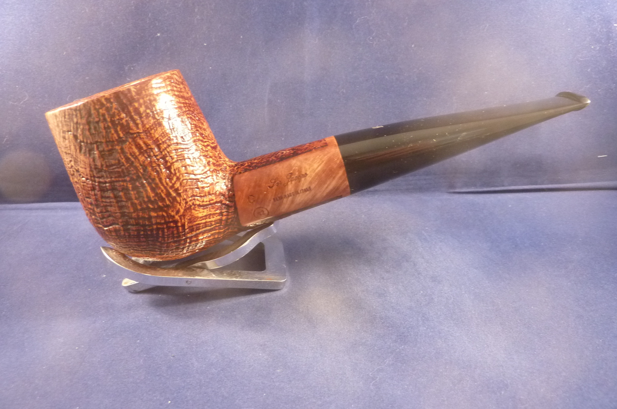 This is a brand new pipe made by Ser Jacopo in Italy. This company has some fine craftsmen, which produce beautiful handmade pipes with great designs and shapes. This sandblasted briar pipe has a giant billiard shape. Acrylic mouthpiece, without filter.