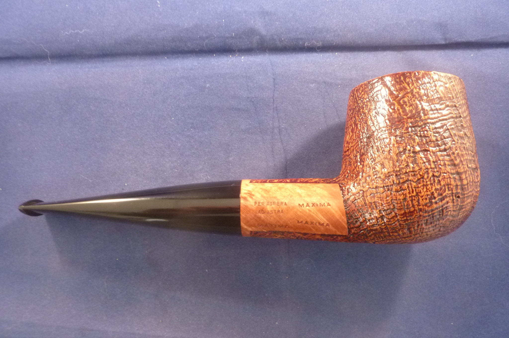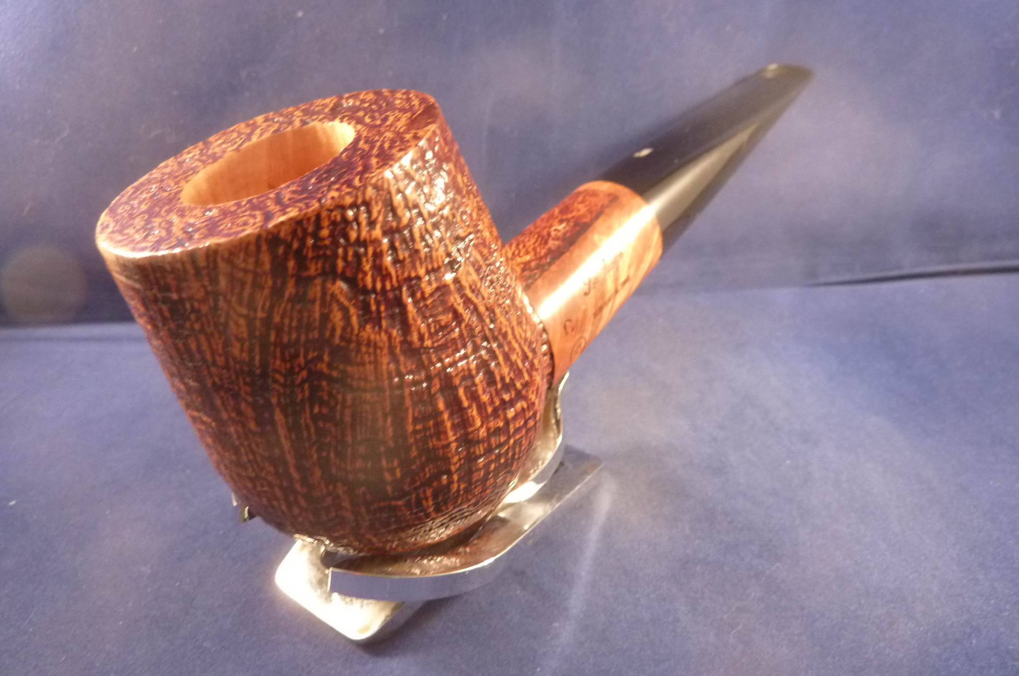 This is a brand new pipe made in Italy. This sandblasted briar pipe has an acrylic mouthpiece, without filter.