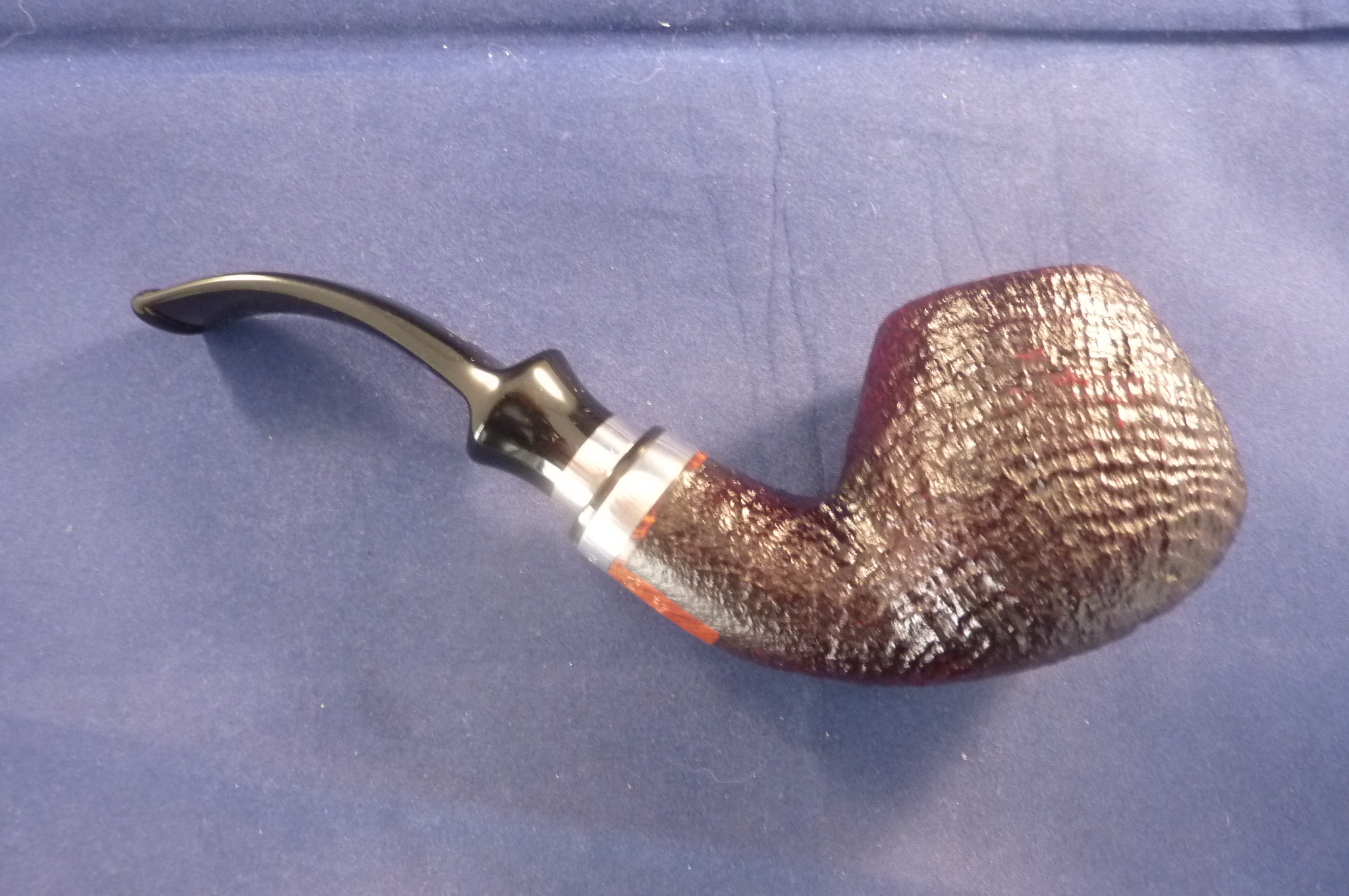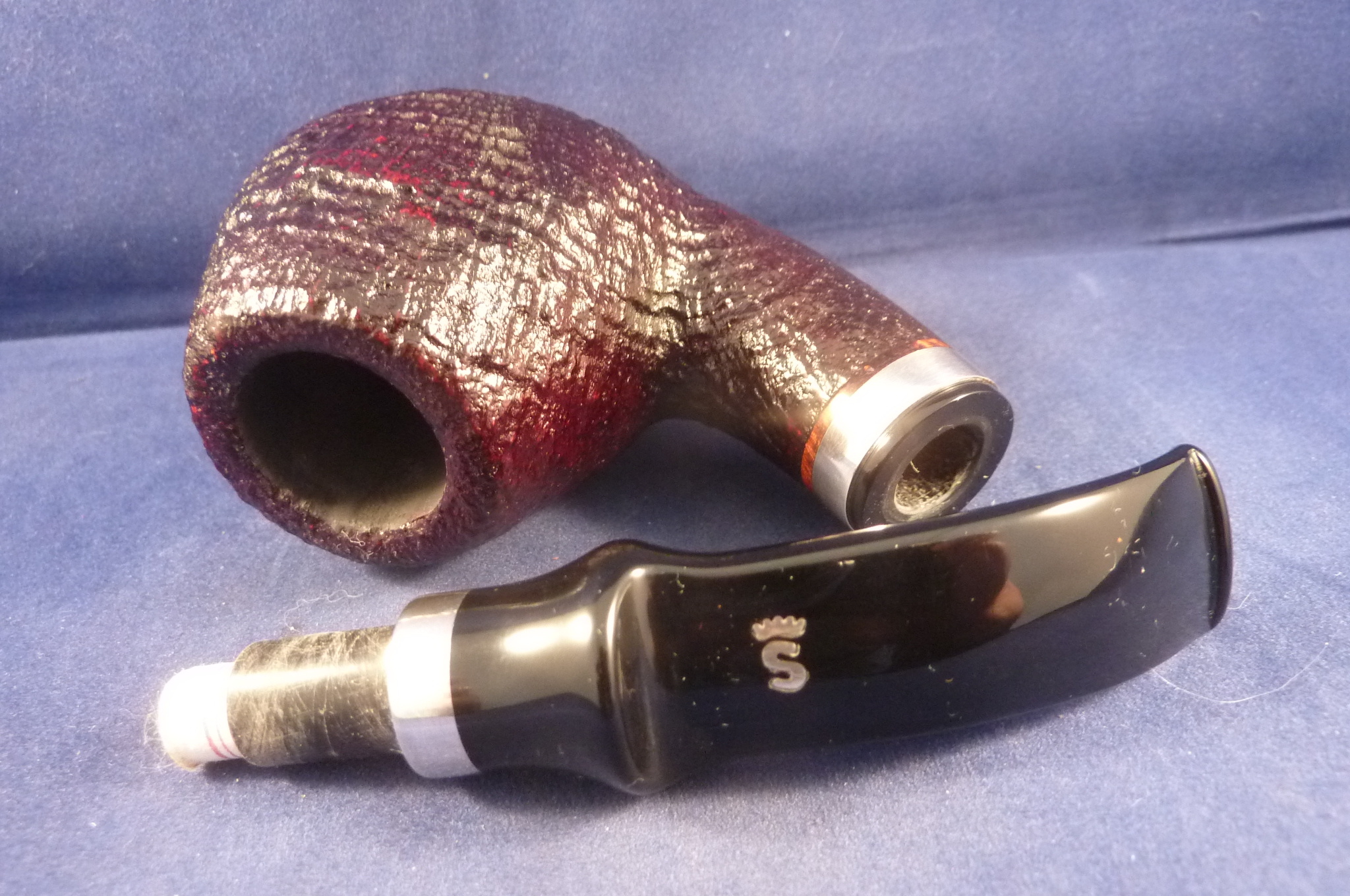 Sandblasted briar pipe with sterling silver applications made by Stanwell in Denmark. Black mouthpiece, with 9 mm. filter.
