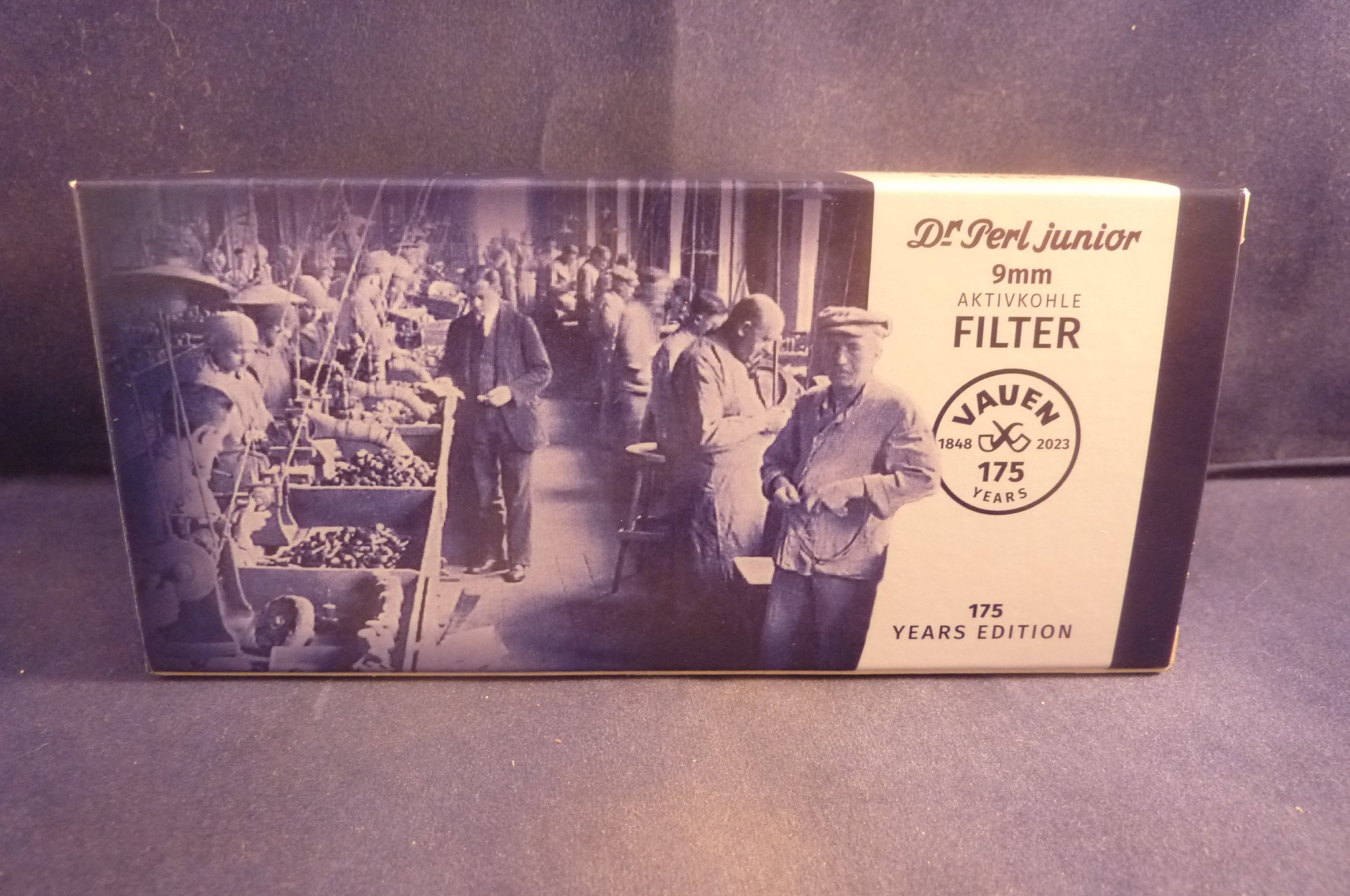 Briar pipe with 2 sterling silver Vauen logos on the stem made by Vauen in Germany. Acrylic mouthpiece with a sterling silver engraved logo, 9 mm. filter. White dot quality. Extra: special limited box with 75 filters.