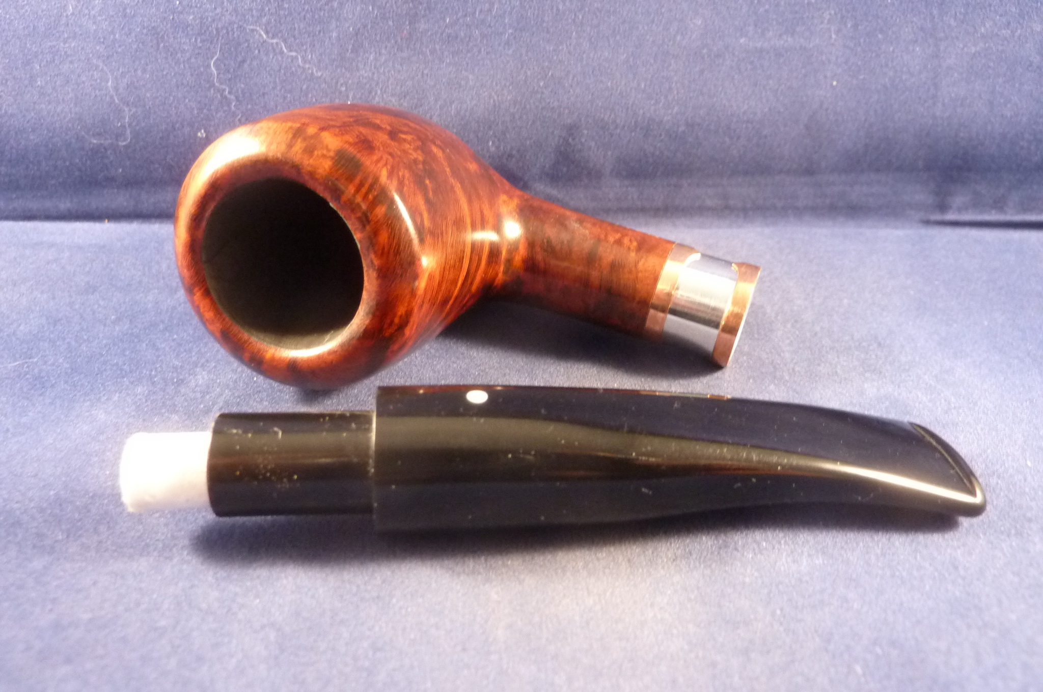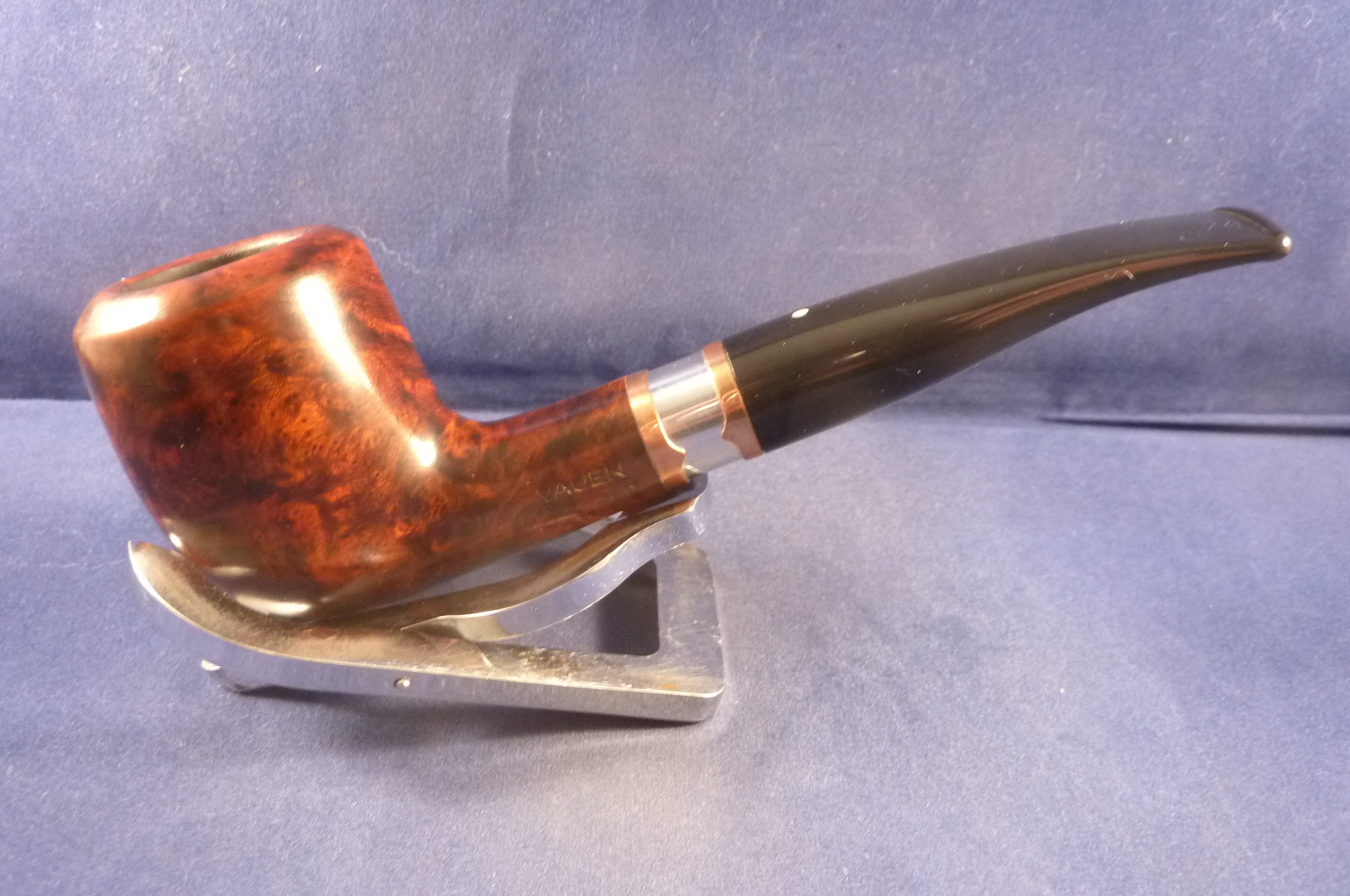 Smooth briar pipe in a brown finish with a copper/aliminium ring made by Vauen in Germany. Acrylic mouthpiece, 9 mm. filter. White dot quality.