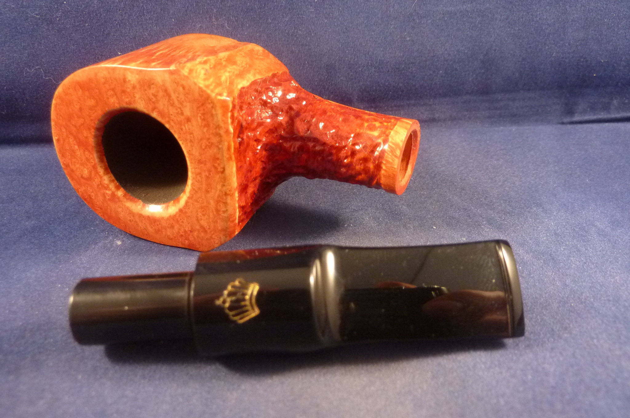 This is a brand new pipe made by Luigi Viprati in Italy. Beautiful hand made rusticated briar pipe with an acrylic ring. Black acrylic mouthpiece, 9 mm. filter.