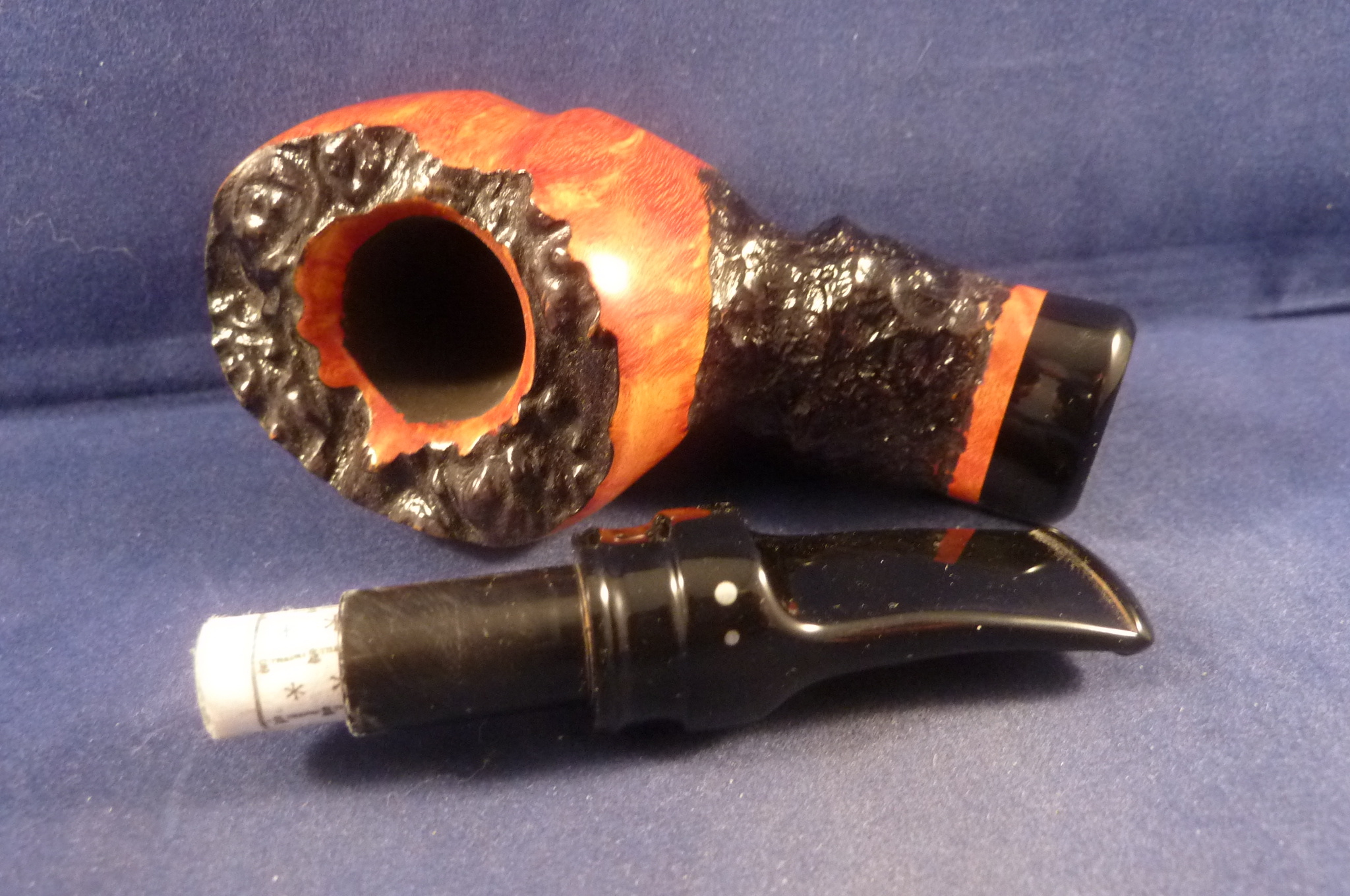 Dark brown sandblasted briar pipe with the contrasting smooth natural finish on top of the bowl and the end of the stem made by Vauen in Germany.